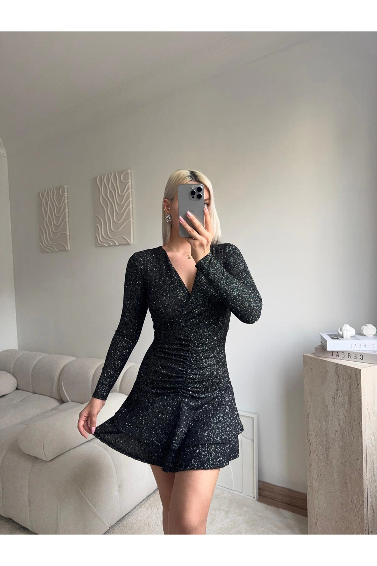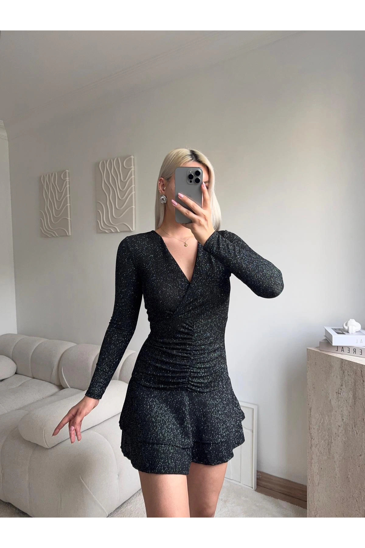 Kruvaze Bel Büzgü Simli Elbise - SİYAH Kruvaze Bel Büzgü Simli Elbise - SİYAH P4230S6173 L