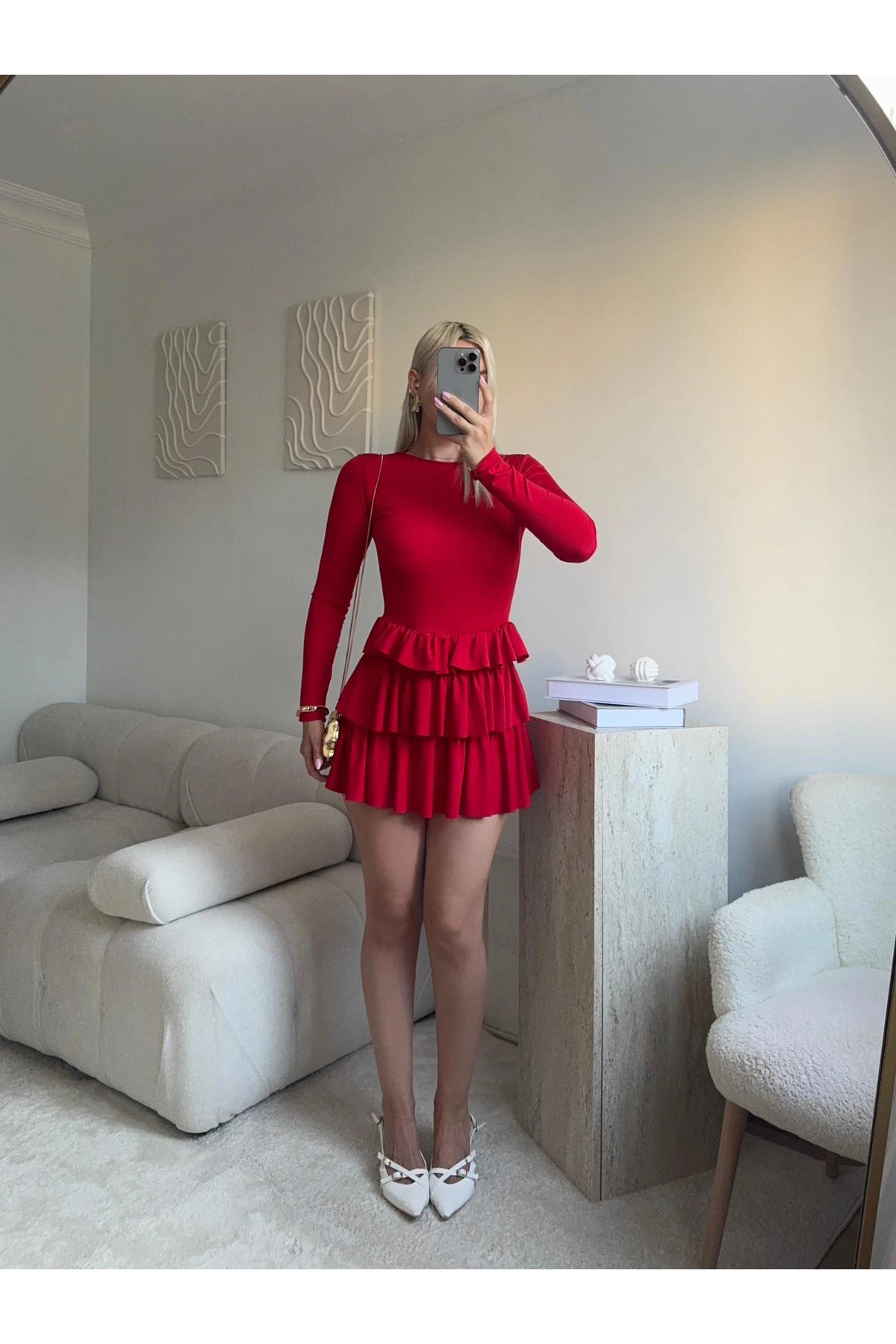 Kruvaze Bel Büzgü Simli Elbise - KIRMIZI Kruvaze Bel Büzgü Simli Elbise - KIRMIZI P4231S2139 L