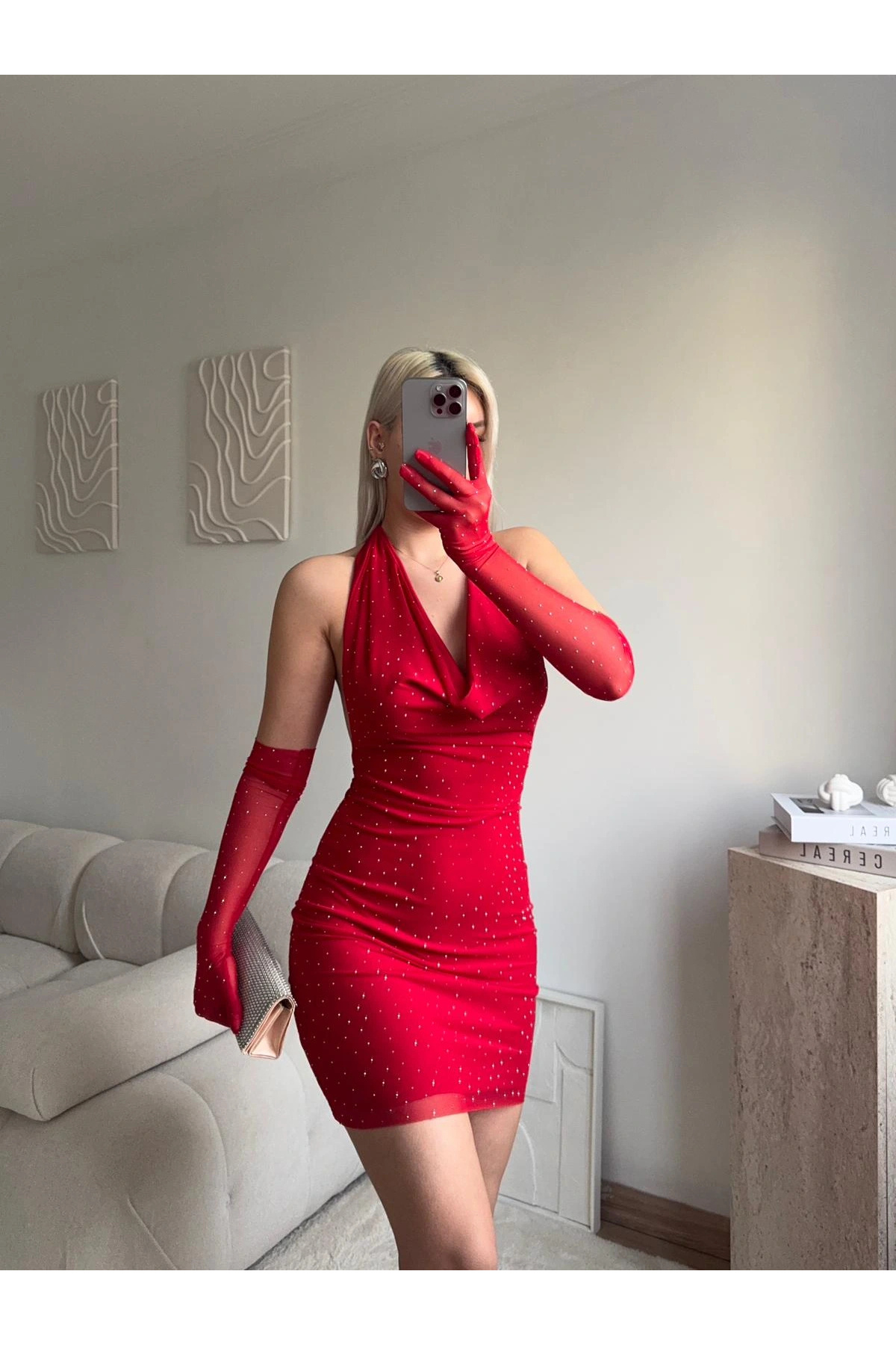 Taşlı Eldivenli Elbise - KIRMIZI Taşlı Eldivenli Elbise - KIRMIZI P4245S5336 L