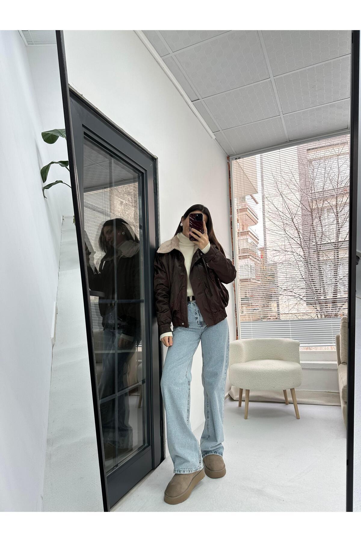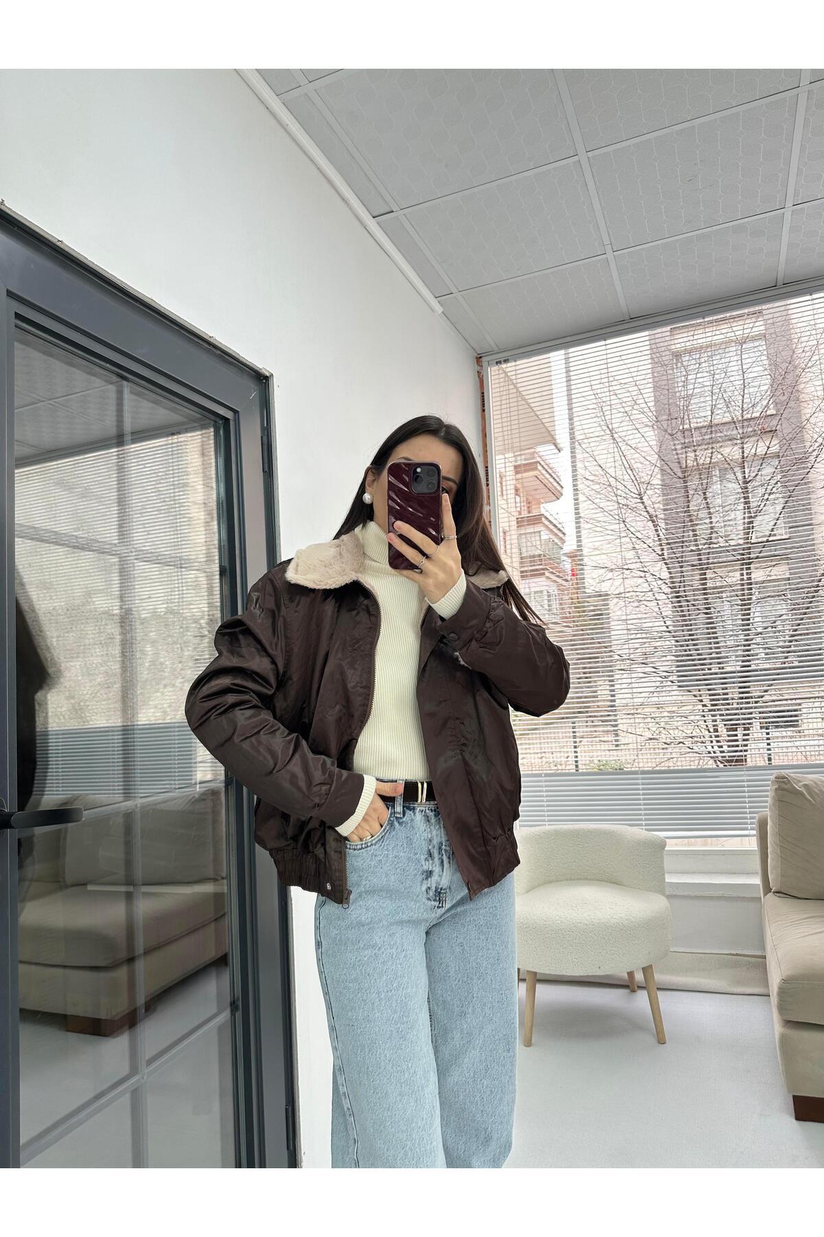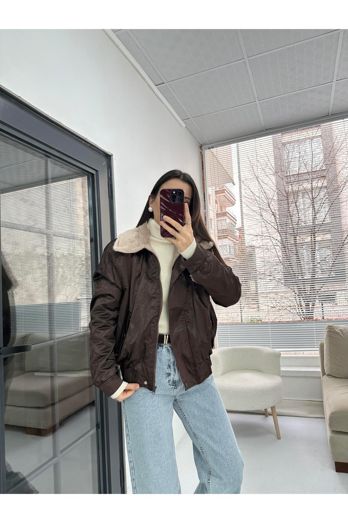 Yakası Kürk Detaylı Kahverengi Bamber Ceket Yakası Kürk Detaylı Kahverengi Bamber Ceket BTGM-1539 L