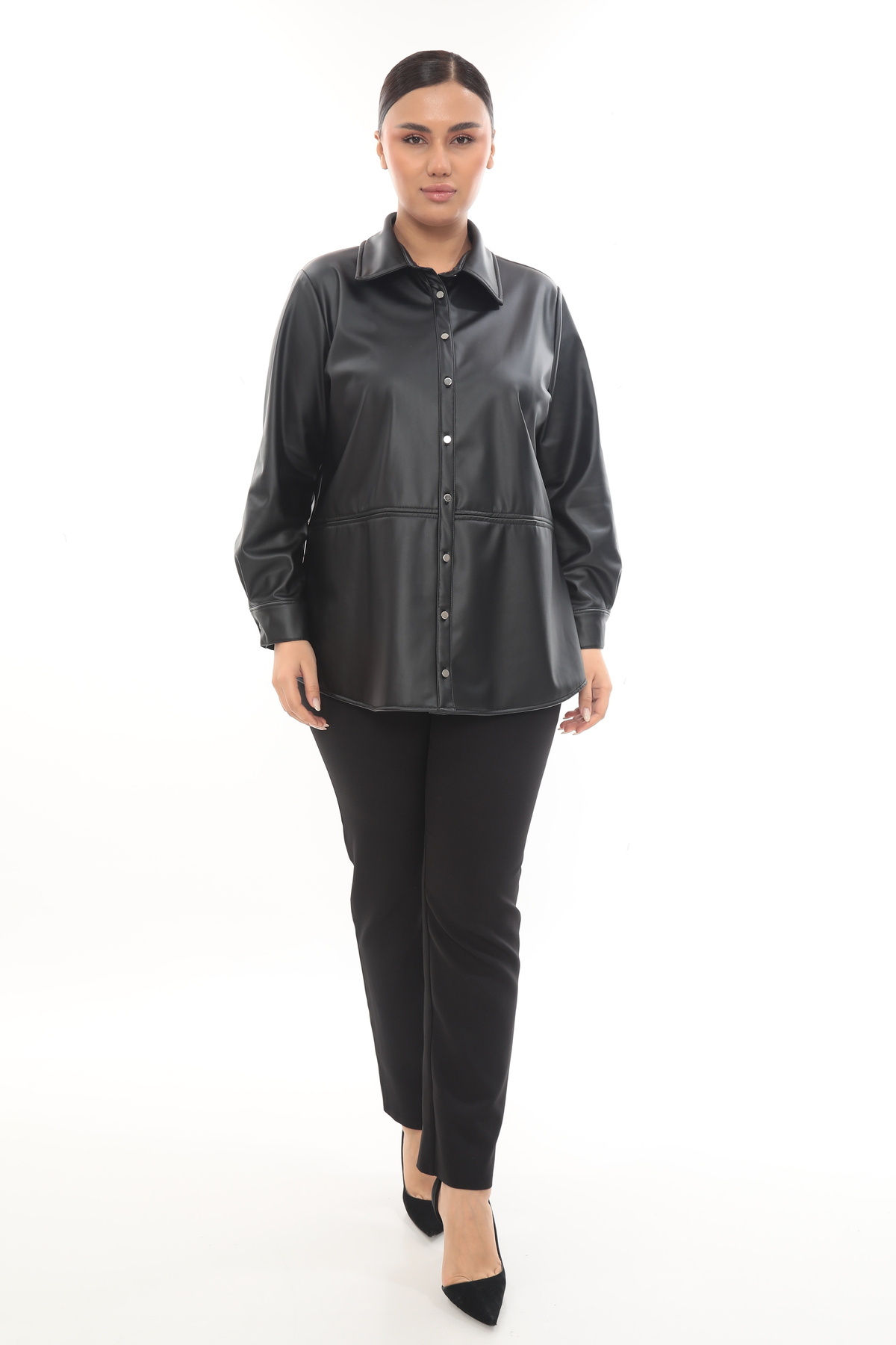 Büyük Beden (50-56) Modern Deri Görünümlü Gömlek Yaka Günlük Kadın Ceket Büyük Beden (50-56) Modern Deri Görünümlü Gömlek Yaka Günlük Kadın Ceket W26.23545-01 56