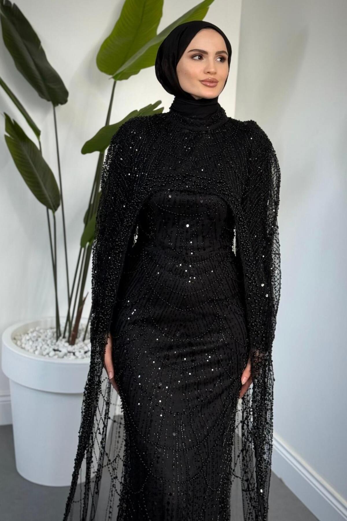 Ardina Pelerinli Boncuk İşlemeli Balık Abiye Siyah Ardina Pelerinli Boncuk İşlemeli Balık Abiye Siyah 5304 44
