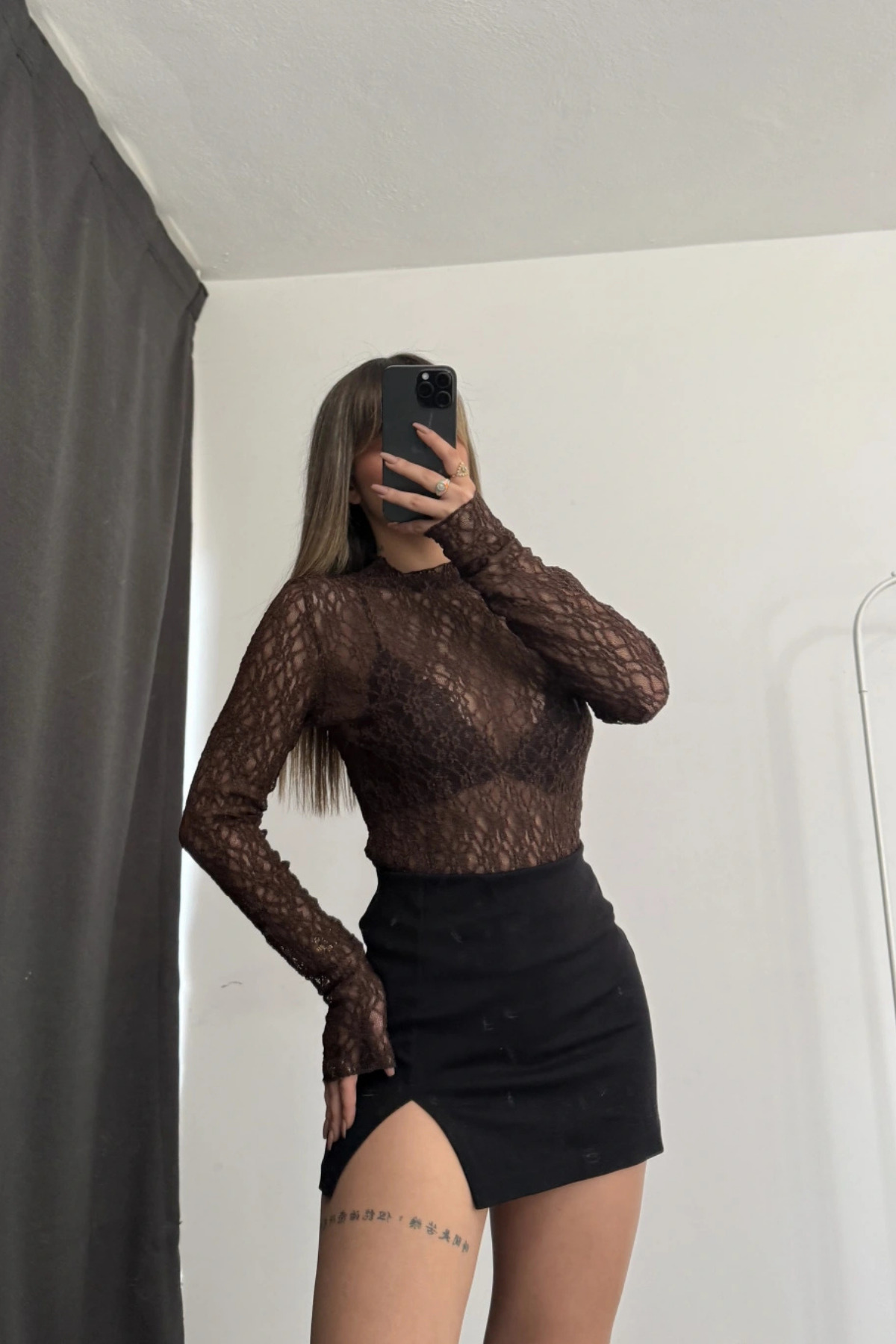 Kadın Kahverengi Uzun Kollu Dantel Transparan Bluz Kadın Kahverengi Uzun Kollu Dantel Transparan Bluz 1041 L