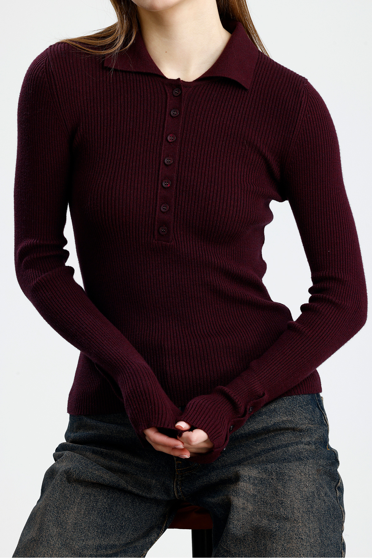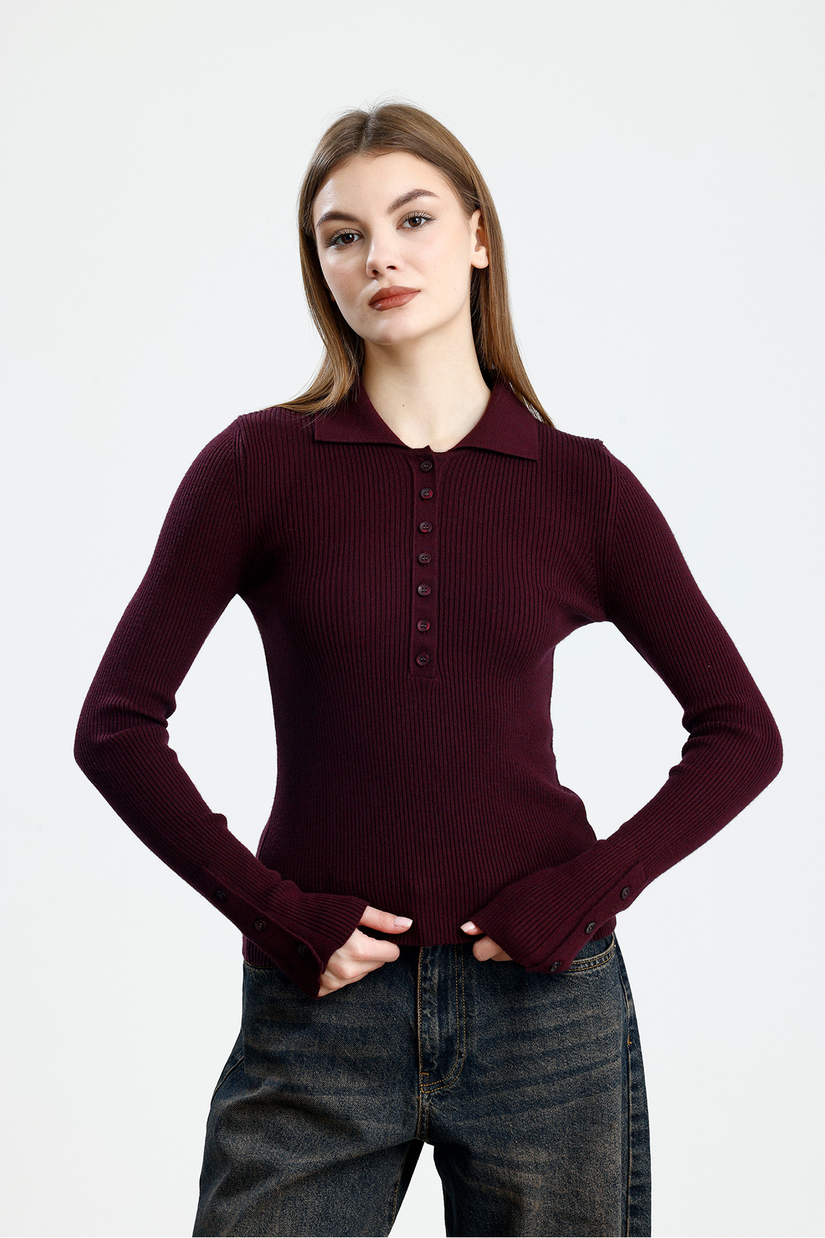 Kol ve Yaka Düğmeli Fitilli Esnek Polo Yaka Body Kazak Kol ve Yaka Düğmeli Fitilli Esnek Polo Yaka Body Kazak FG4766 Standart