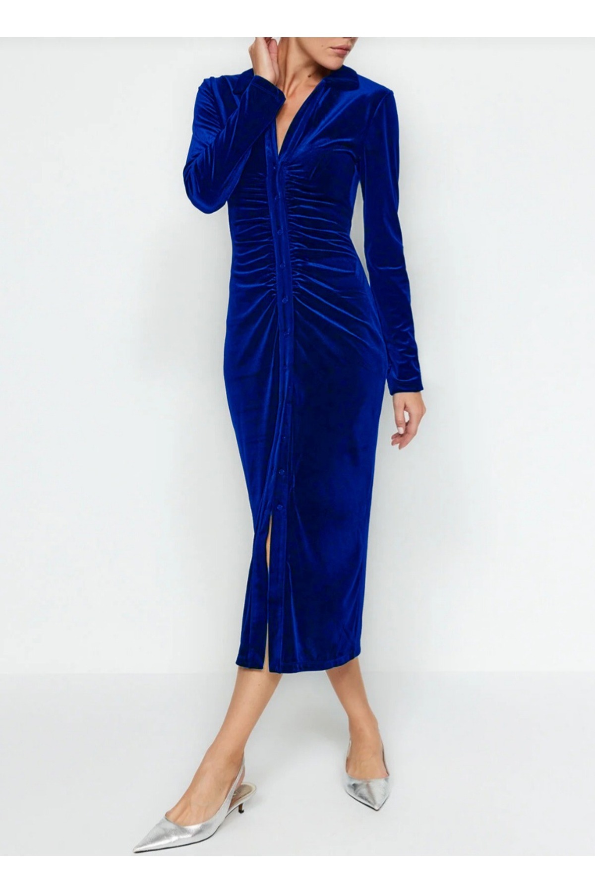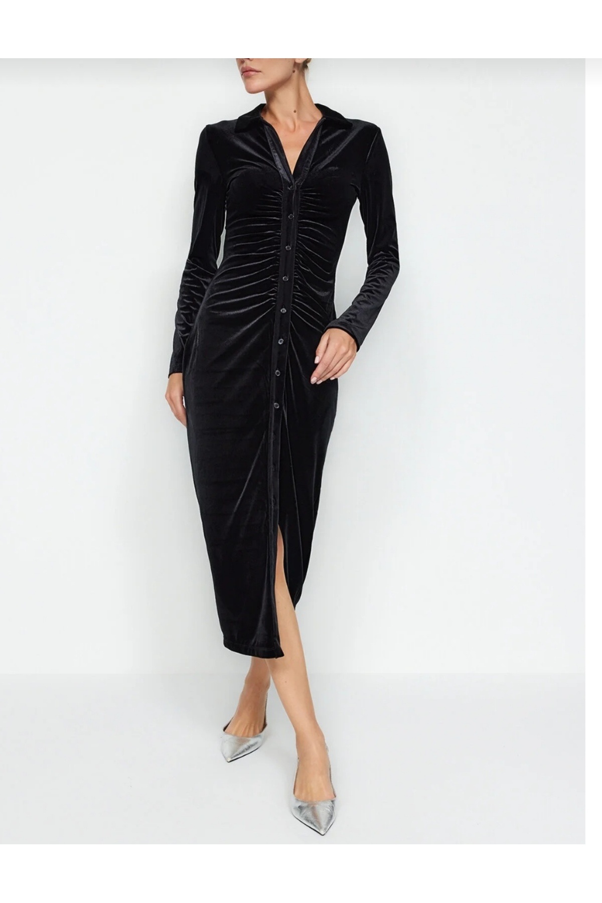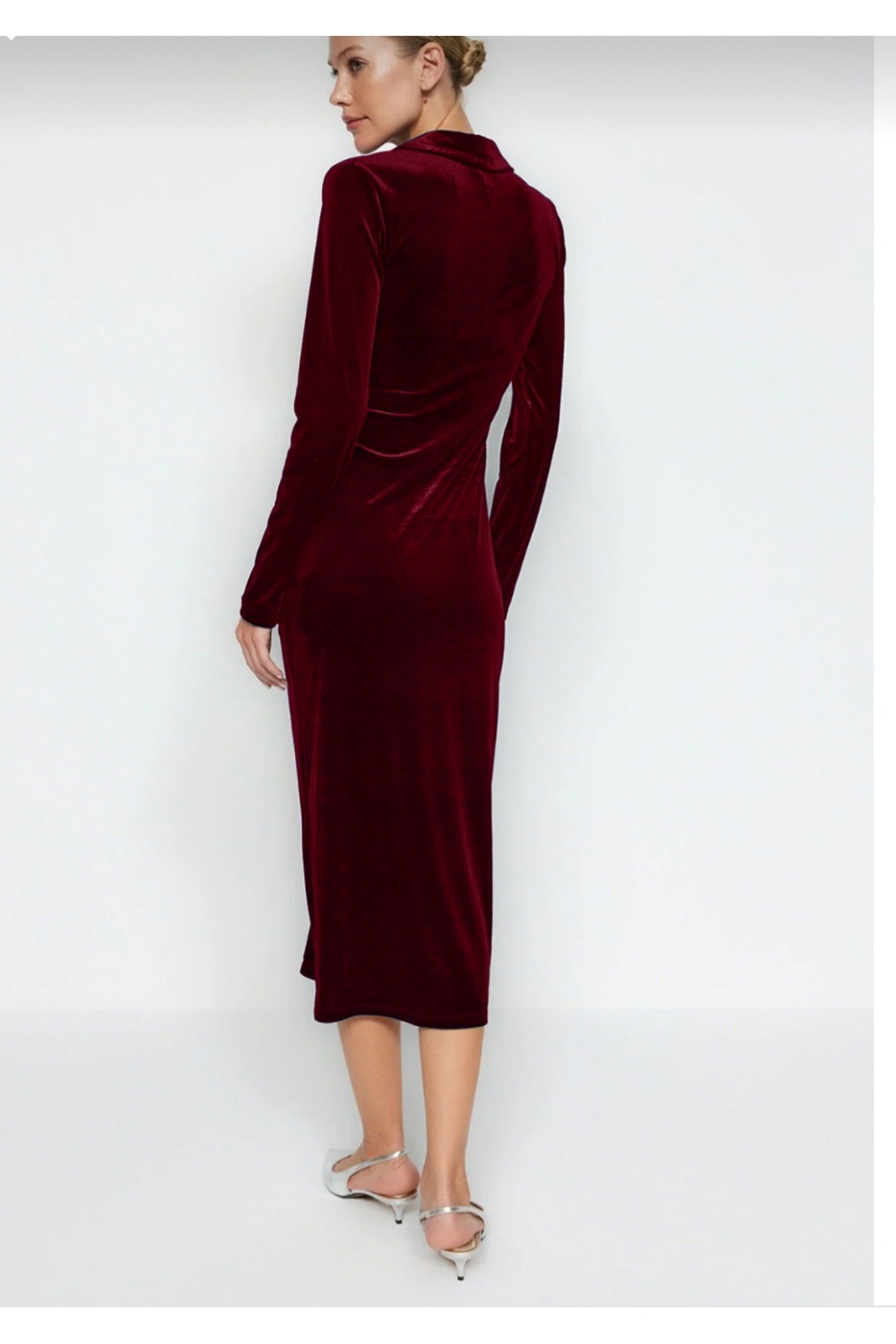 Vucuda Oturan Polo Yaka Büzgü Detay Midi Boy Esnek Kadife Kalem Elbise Vucuda Oturan Polo Yaka Büzgü Detay Midi Boy Esnek Kadife Kalem Elbise vera0016 XL