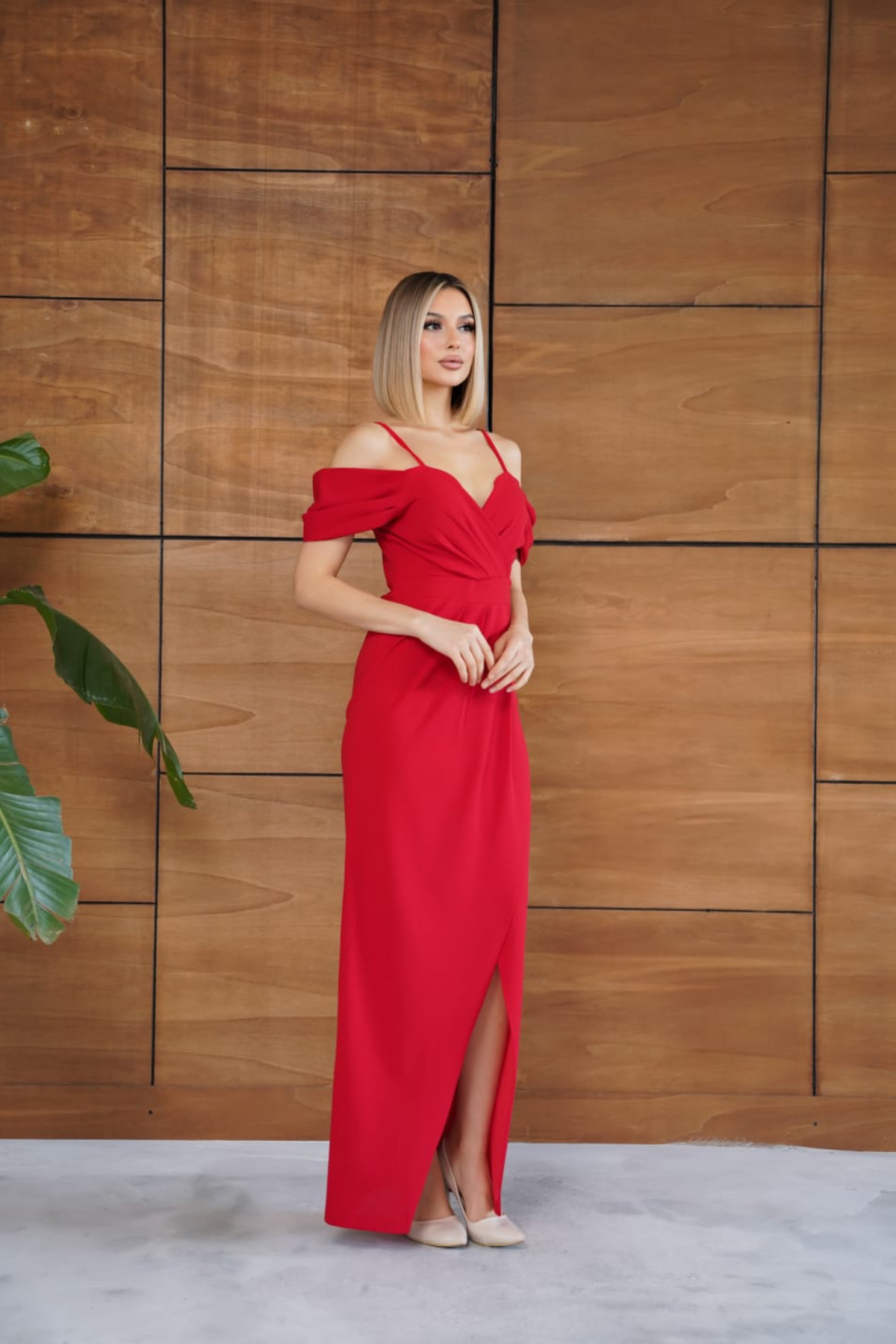 Kadın Kırmızı Kruvaze Yaka Omuz Açık Uzun Abiye Elbise Kadın Kırmızı Kruvaze Yaka Omuz Açık Uzun Abiye Elbise t98 L
