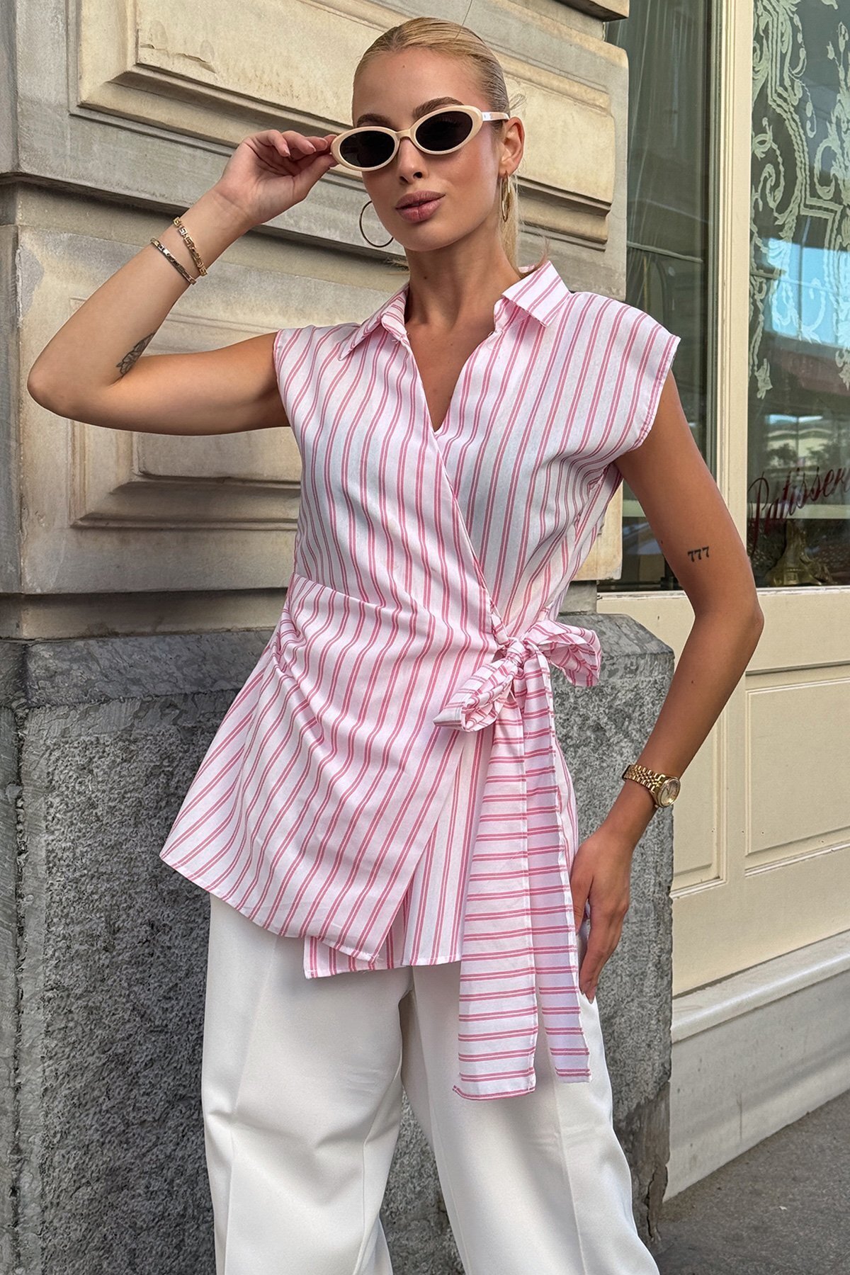 Kadın Pembe Gömlek Yaka Bağlama Detaylı Çizgili Bluz Vs00720 Kadın Pembe Gömlek Yaka Bağlama Detaylı Çizgili Bluz Vs00720 VS00720 L