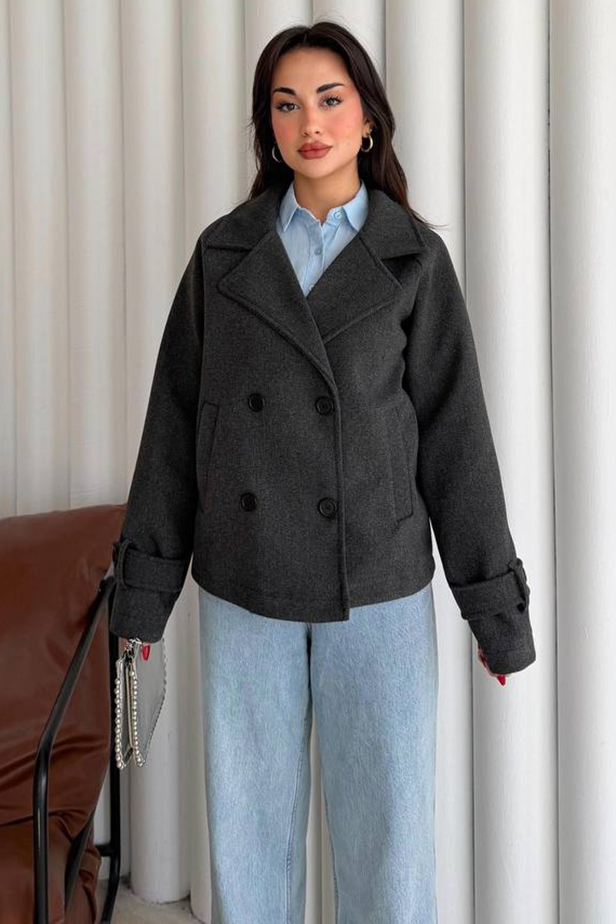 Kadın Antrasit Kruvaze Yaka Çift Cepli Düğmeli Astarlı Kaban VS01632 Kadın Antrasit Kruvaze Yaka Çift Cepli Düğmeli Astarlı Kaban VS01632 XL