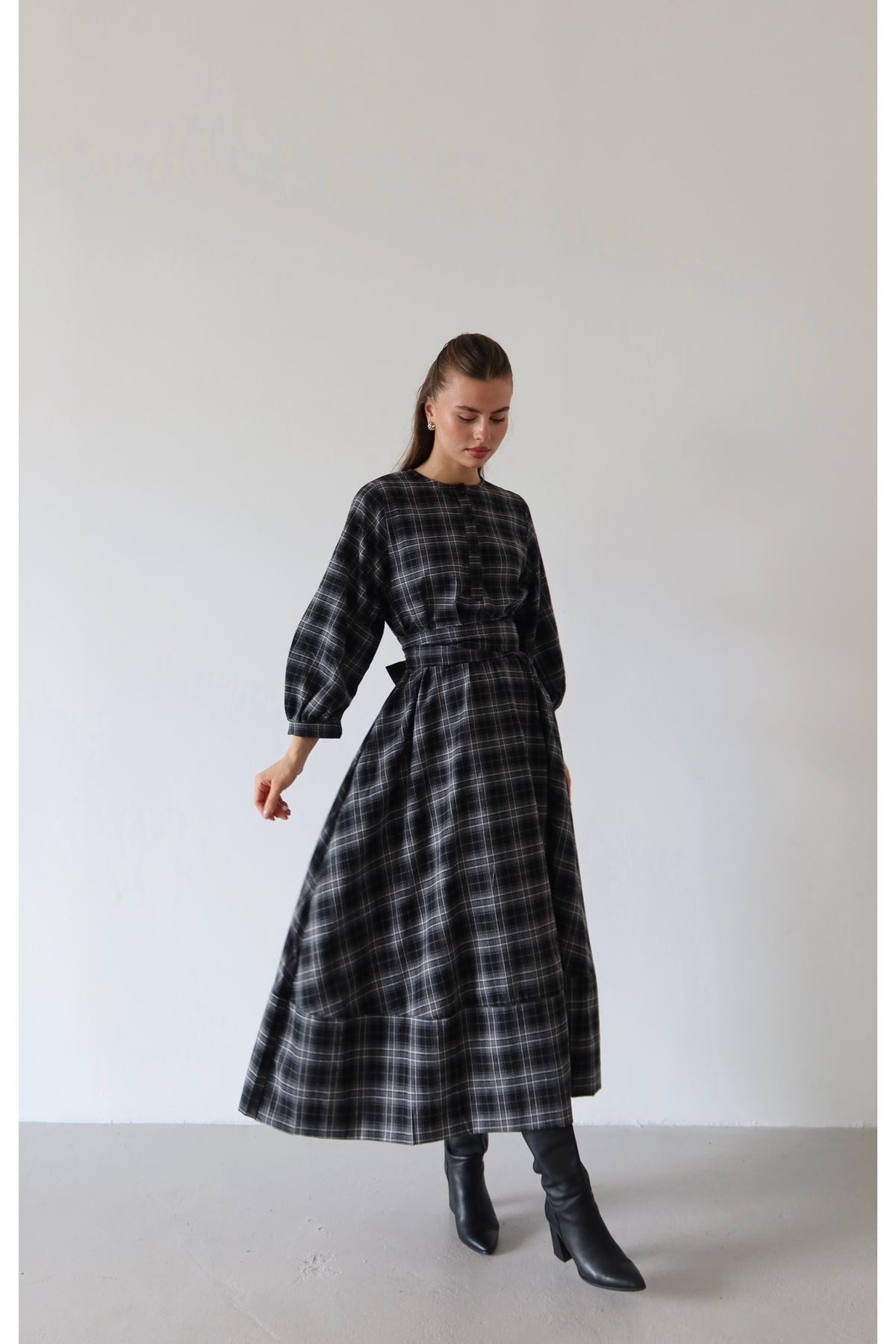 Ekose Desen Bel Pensli Elbise Ekose Desen Bel Pensli Elbise EH-6238 L