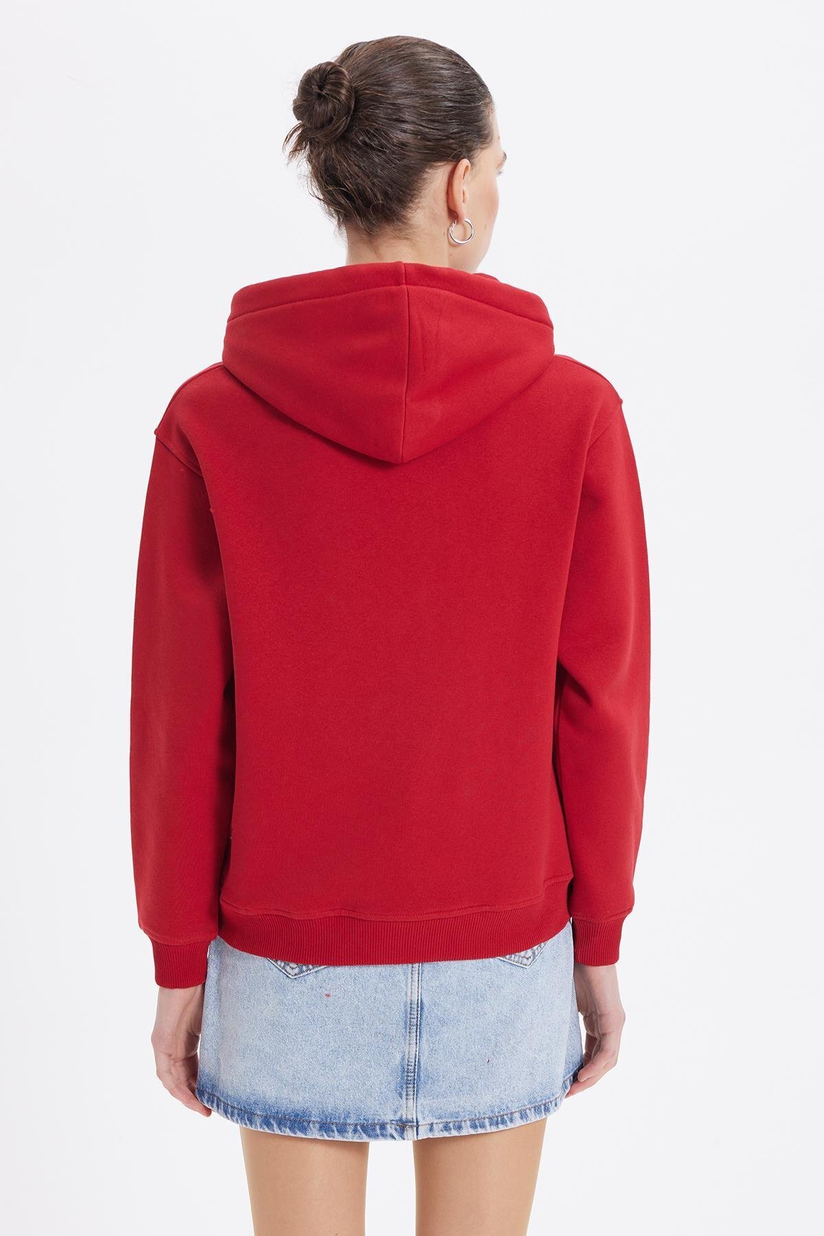 Kadın Relax Fit Rahat Kesim Pamuklu Kapüşonlu Kanguru Cepli Kırmızı Sweatshirt Kadın Relax Fit Rahat Kesim Pamuklu Kapüşonlu Kanguru Cepli Kırmızı Sweatshirt SW250024 XL