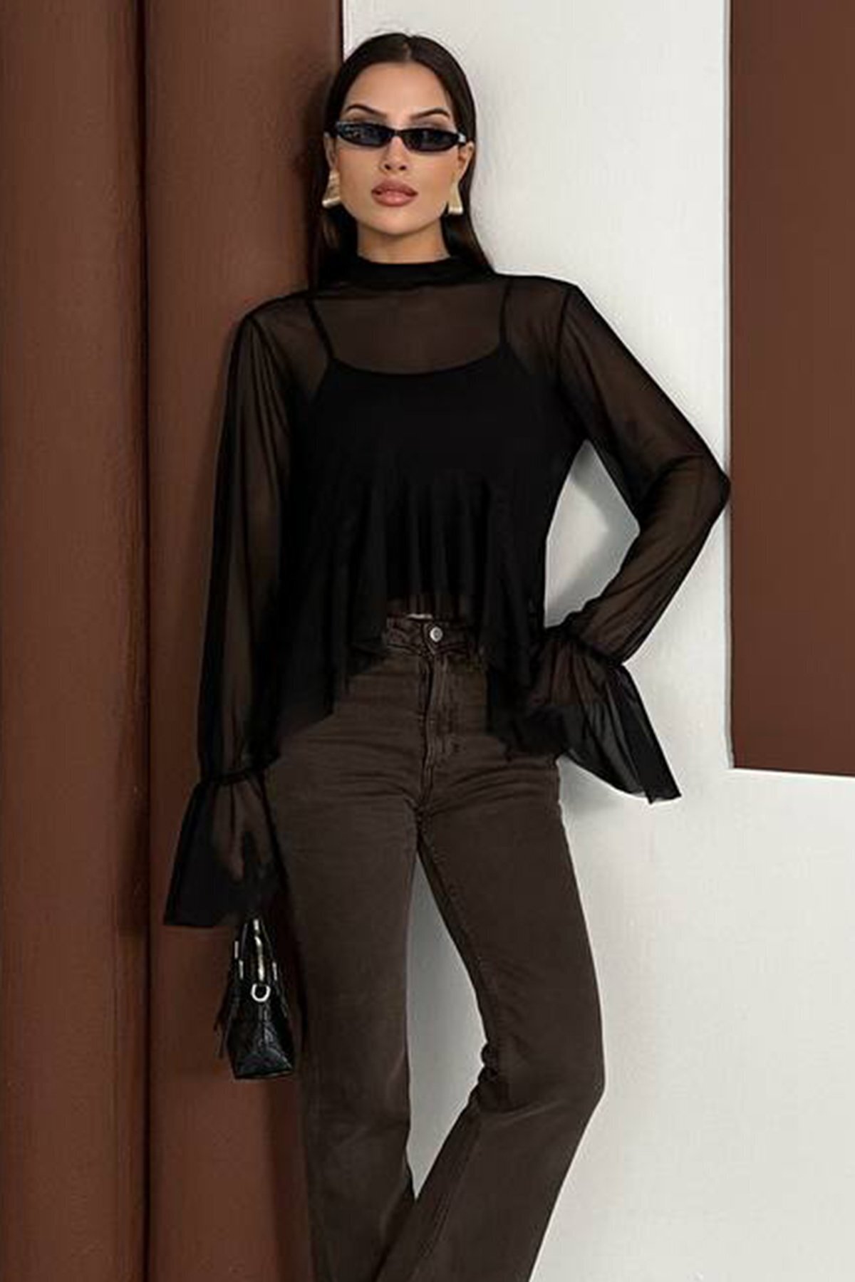 Kadın Kahverengi Transparan Şifon Volan Kol Bluzve Askılı Atlet İkili Takım Vs01604 Kadın Kahverengi Transparan Şifon Volan Kol Bluzve Askılı Atlet İkili Takım Vs01604 VS01604 XL