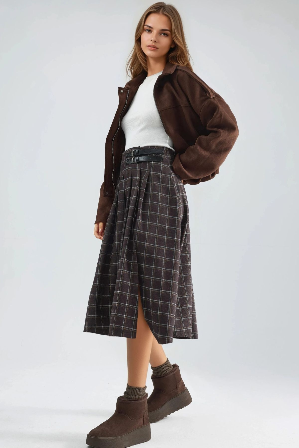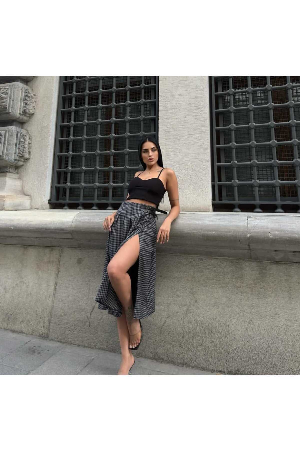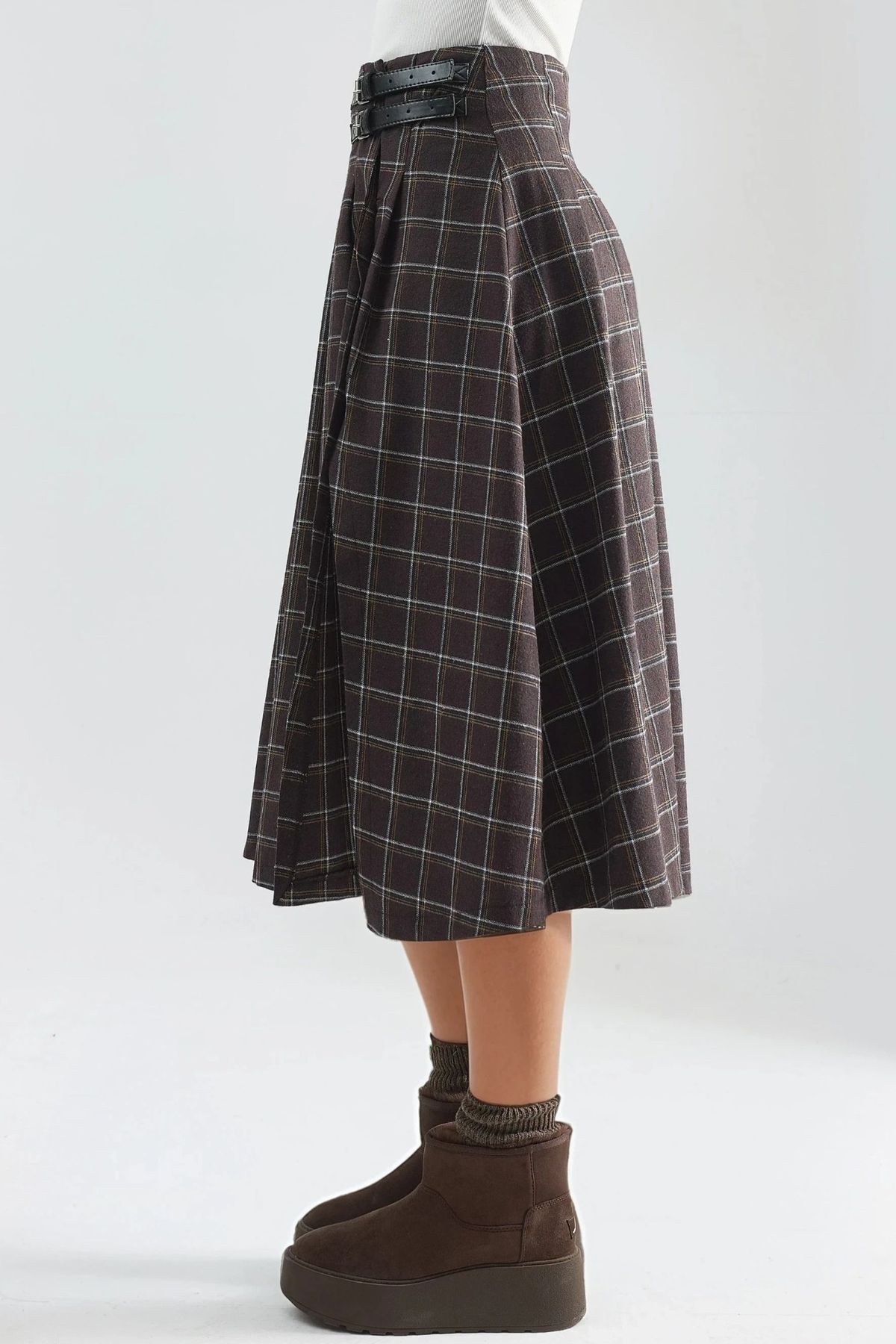 Kemer Detaylı Kareli Pileli Midi Etek Kemer Detaylı Kareli Pileli Midi Etek MH0PUGGO XL