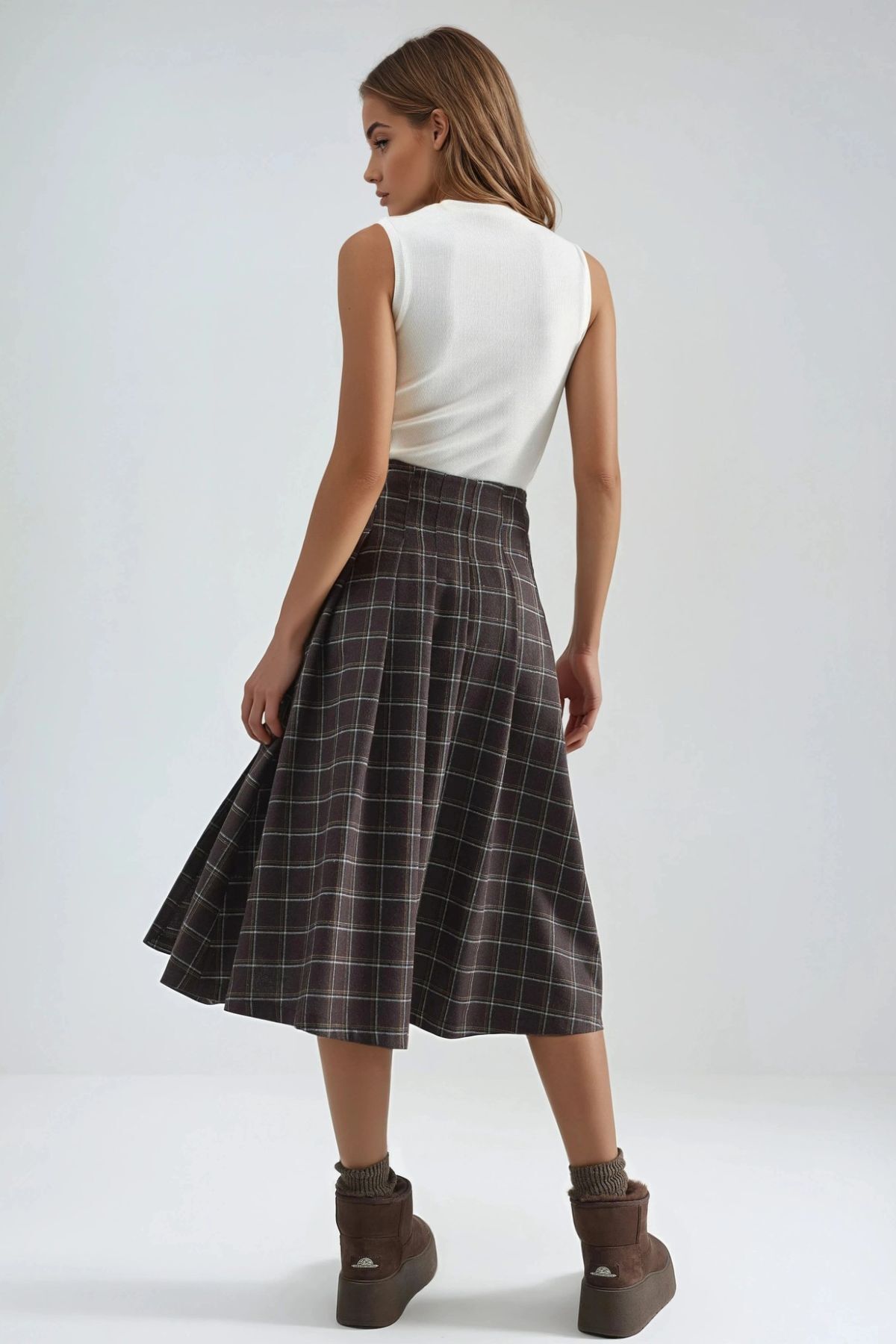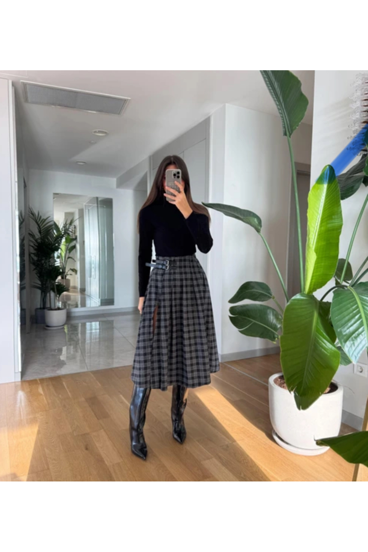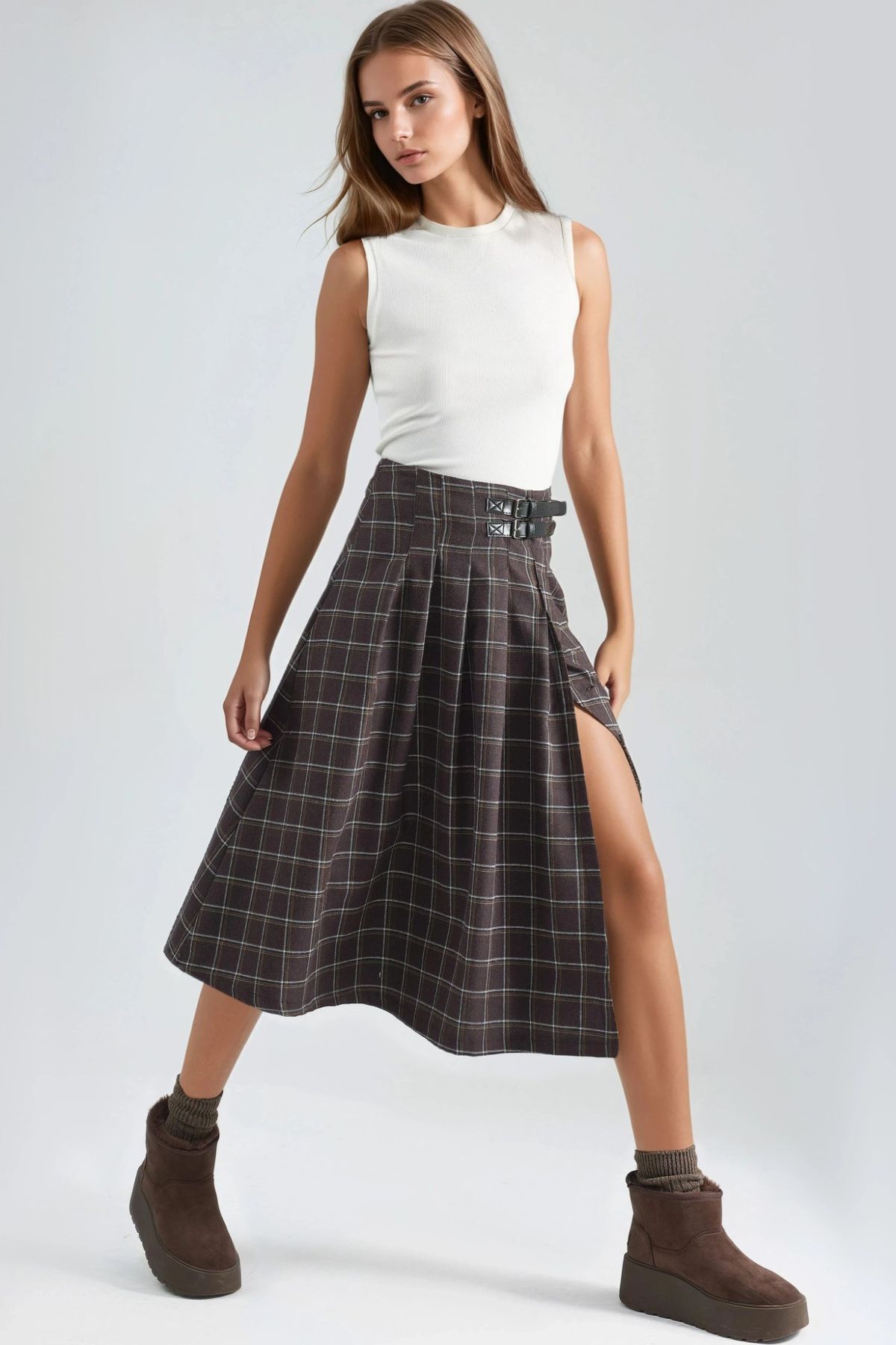 Kemer Detaylı Kareli Pileli Midi Etek Kemer Detaylı Kareli Pileli Midi Etek MH0PUGGO XL