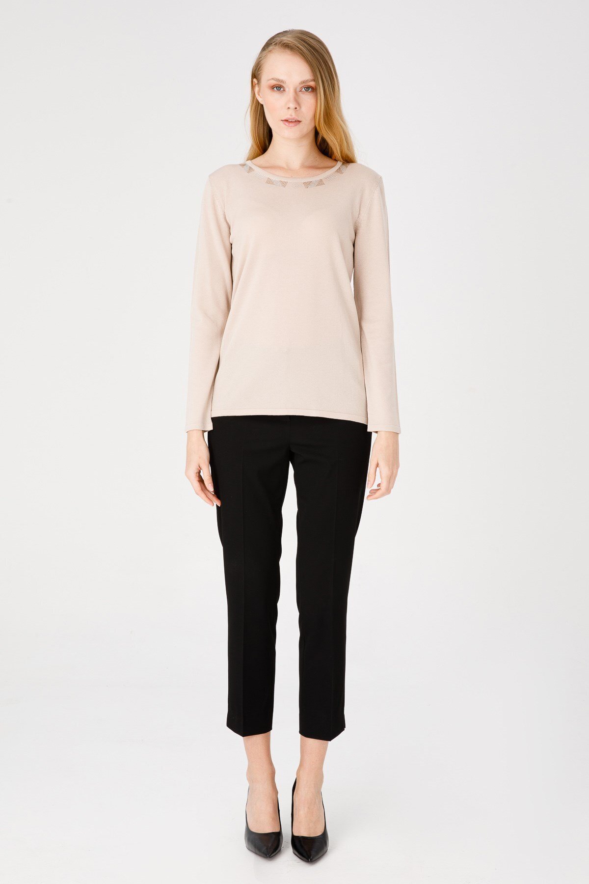 Kadın Sıfır Yaka Uzun Kol Yakası Taşlı Triko Bluz Vizon Kadın Sıfır Yaka Uzun Kol Yakası Taşlı Triko Bluz Vizon 21355 XL