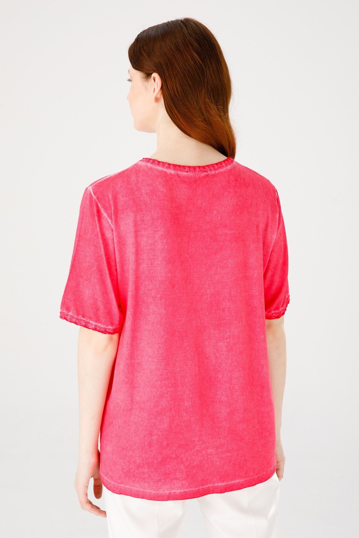 Kadın Sıfır Yaka Kısa Kol Deri Işlemeli Penye Bluz Fuşya Kadın Sıfır Yaka Kısa Kol Deri Işlemeli Penye Bluz Fuşya 20807 XL