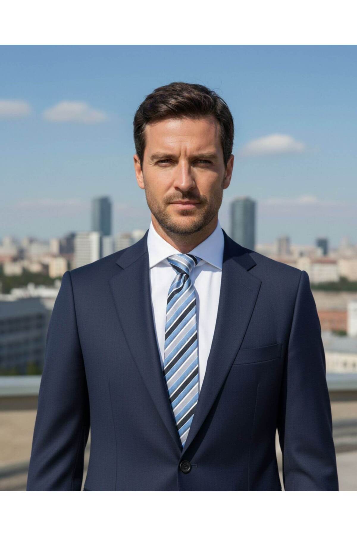Gri Mavi Çizgili 8 cm Genişliğinde Klasik Kravat Gri Mavi Çizgili 8 cm Genişliğinde Klasik Kravat K0009 تک سایز