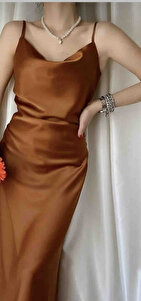 Kadın Saten Kahverengi Midi Boy Ince Askılı ( Ayarlanabilir ) Elbise Kadın Saten Kahverengi Midi Boy Ince Askılı ( Ayarlanabilir ) Elbise STN123 M