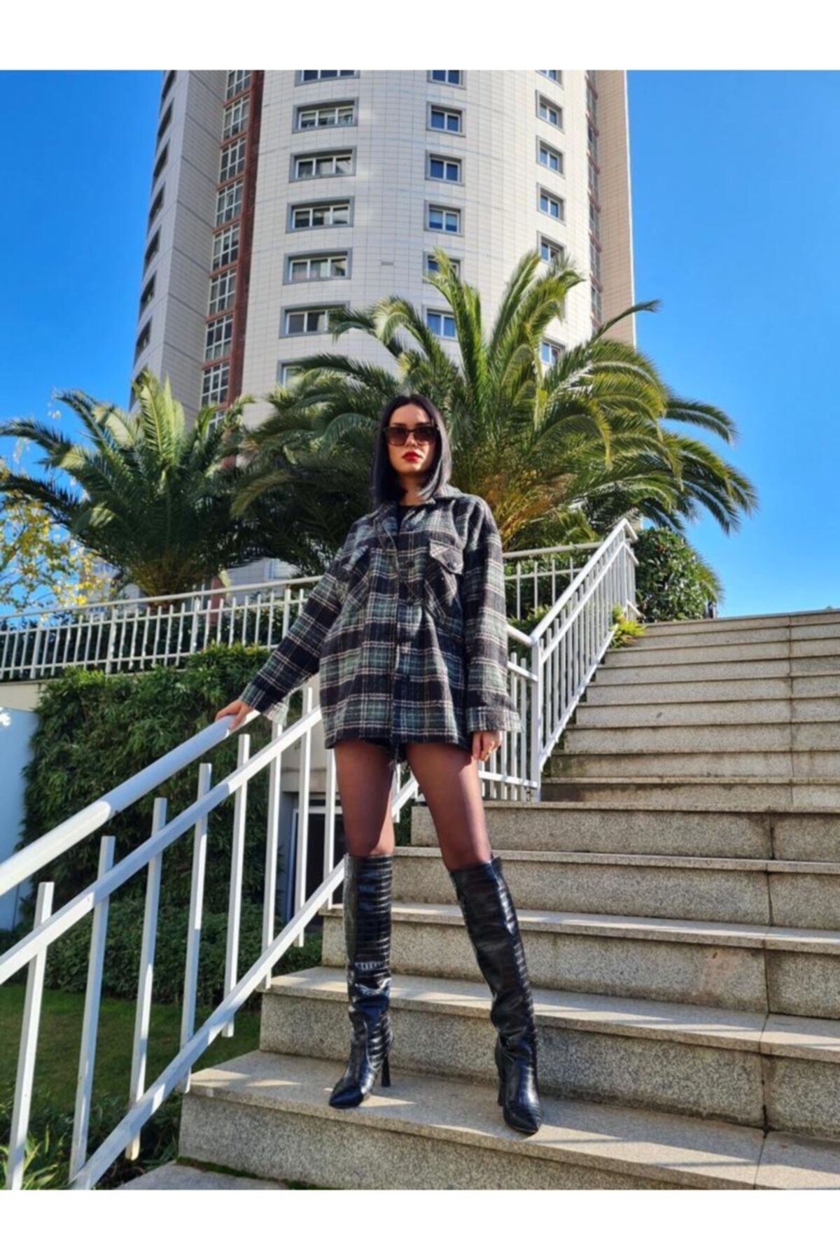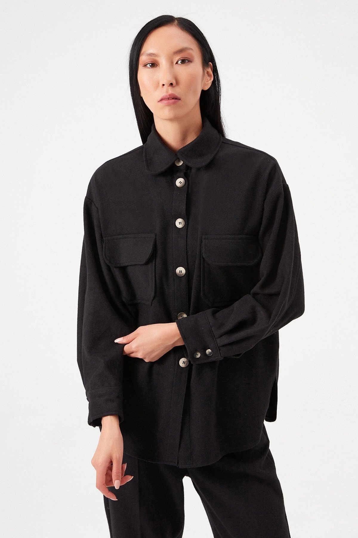 Kadın Siyah Geçişli Ekose Desenli Pamuklu Oversize Kaşe Oduncu Gömlek Ceket Kadın Siyah Geçişli Ekose Desenli Pamuklu Oversize Kaşe Oduncu Gömlek Ceket OG1001 Standart