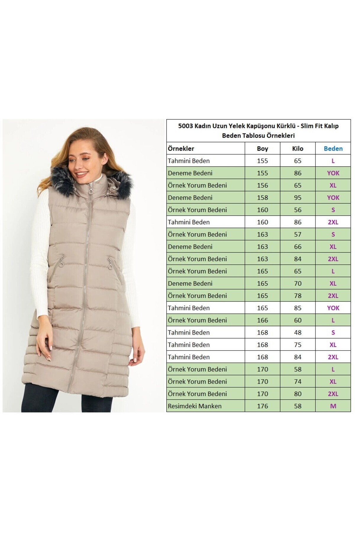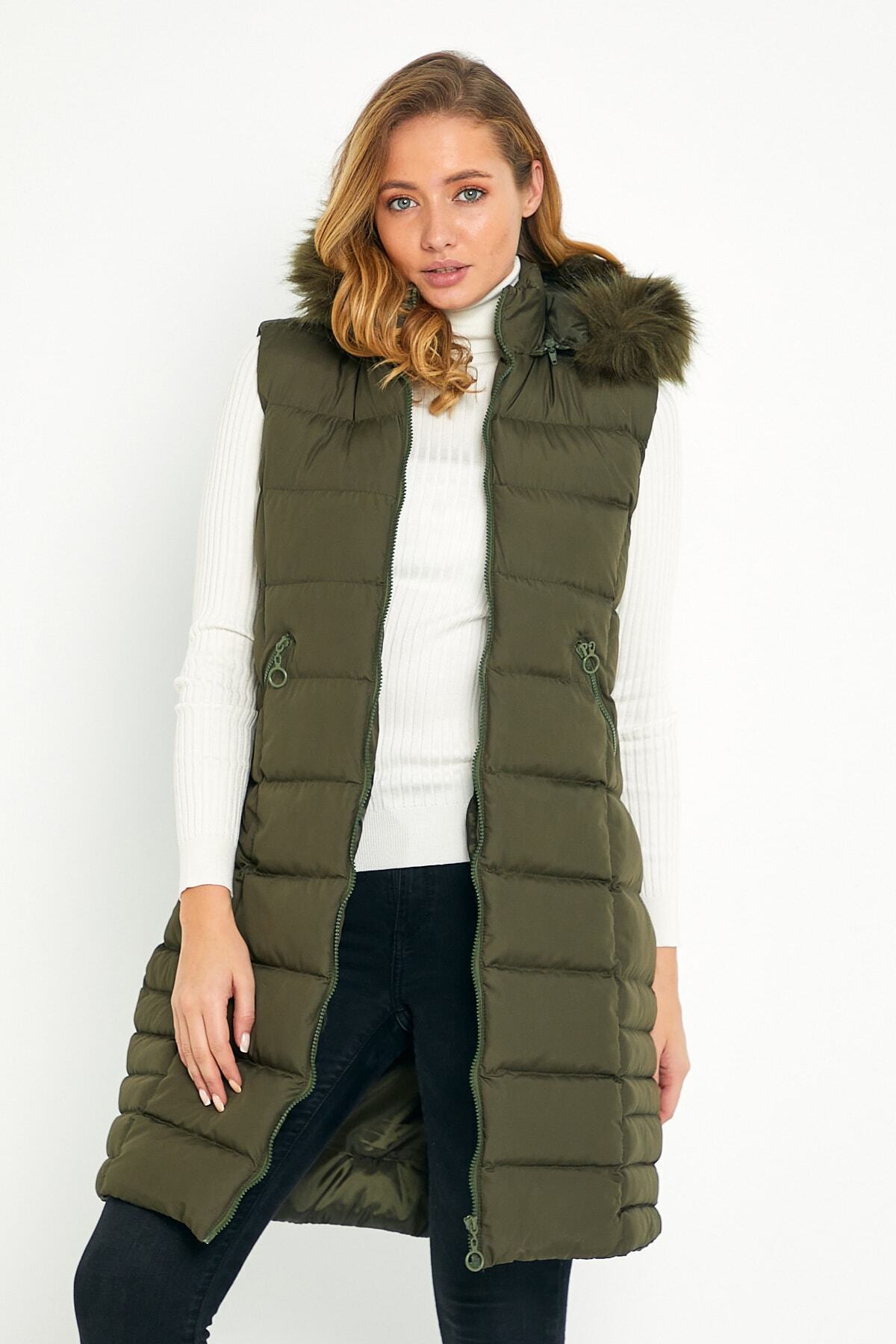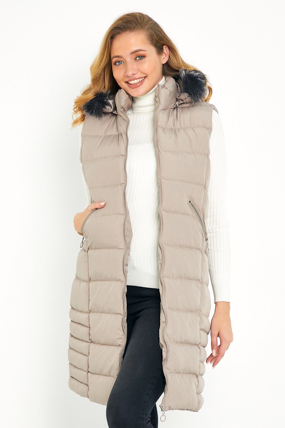 Kadın Taş Uzun Yelek Kapüşon Kürklü Kadın Taş Uzun Yelek Kapüşon Kürklü 5003 2XL