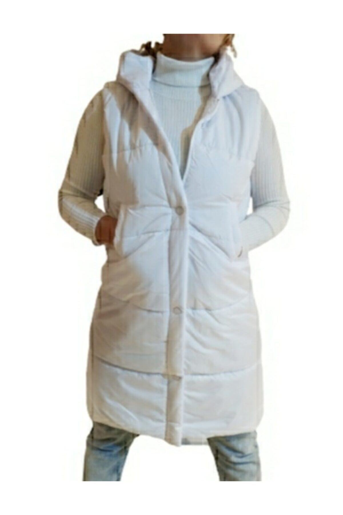 Kadın Beyaz Uzun Yelek Kapüşon Kürklü Kadın Beyaz Uzun Yelek Kapüşon Kürklü 5003 2XL