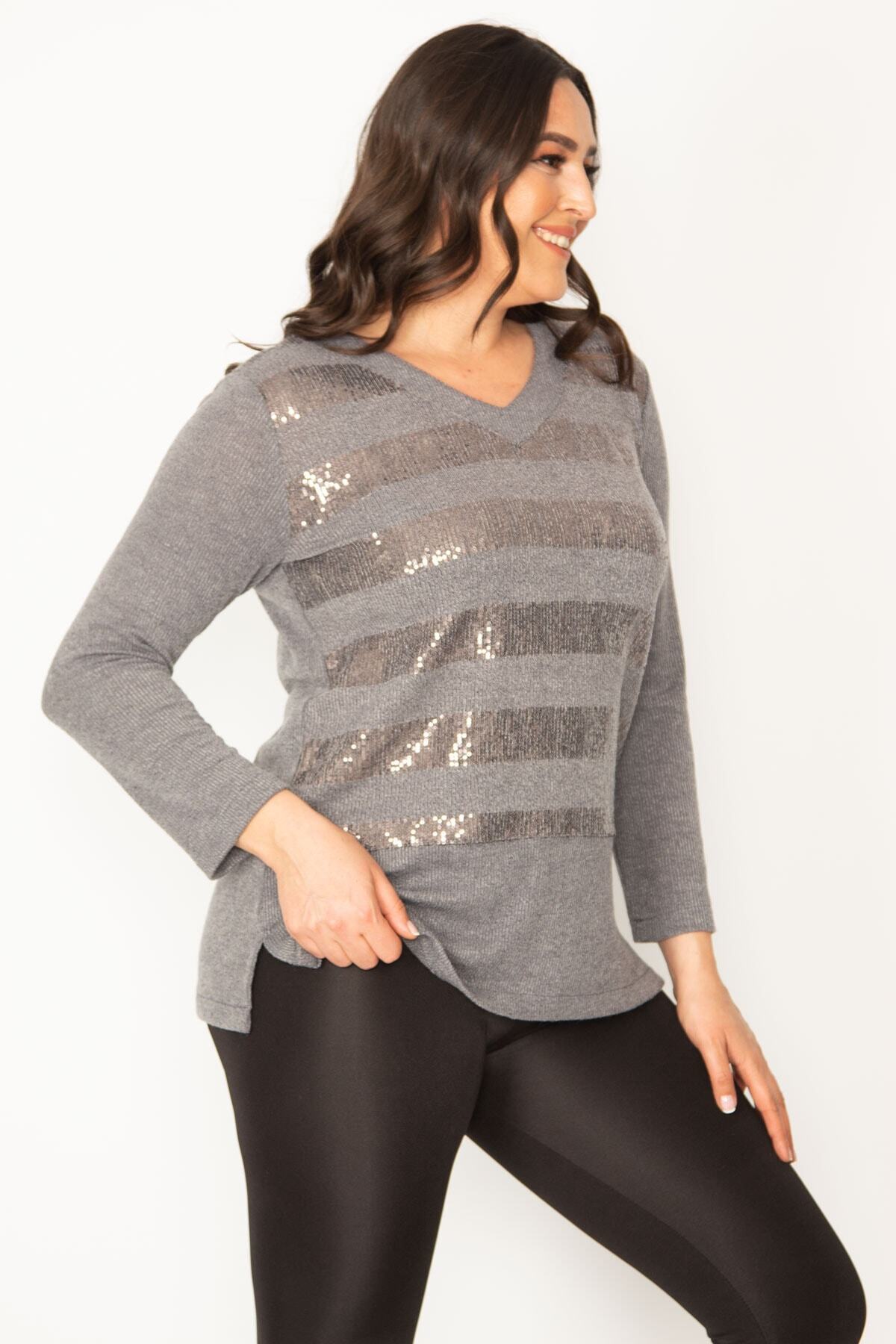 Kadın Büyük Beden Gri Pul Payet Detaylı V Yaka Bluz 65n30407 Kadın Büyük Beden Gri Pul Payet Detaylı V Yaka Bluz 65n30407 65N30407 54