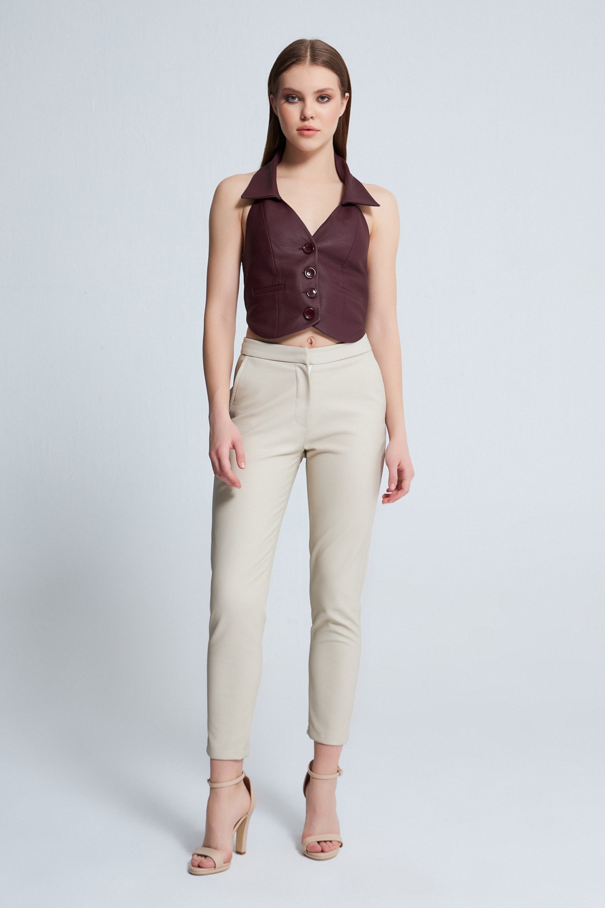 Yaka Detaylı Göğüsü Düğmeli Deri Yelek Siyah Yaka Detaylı Göğüsü Düğmeli Deri Yelek Siyah BK-00205-1 42