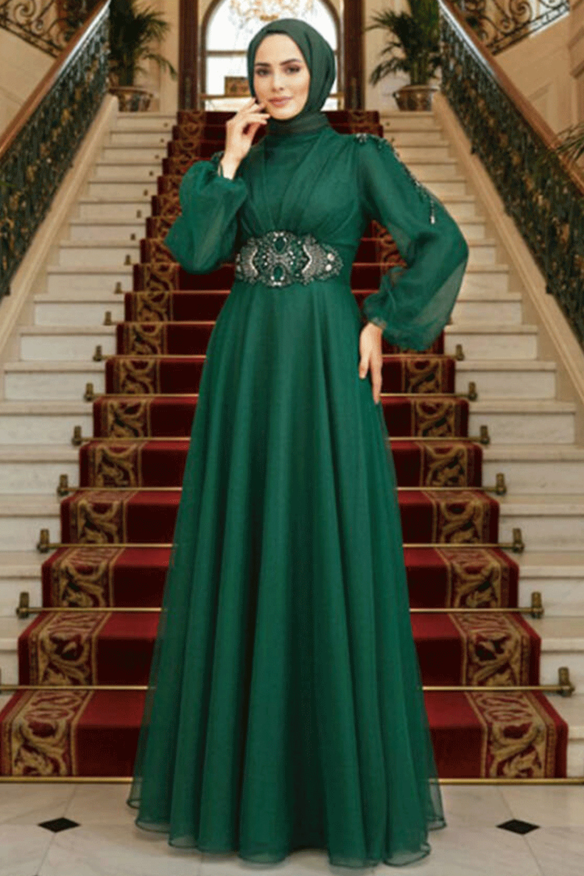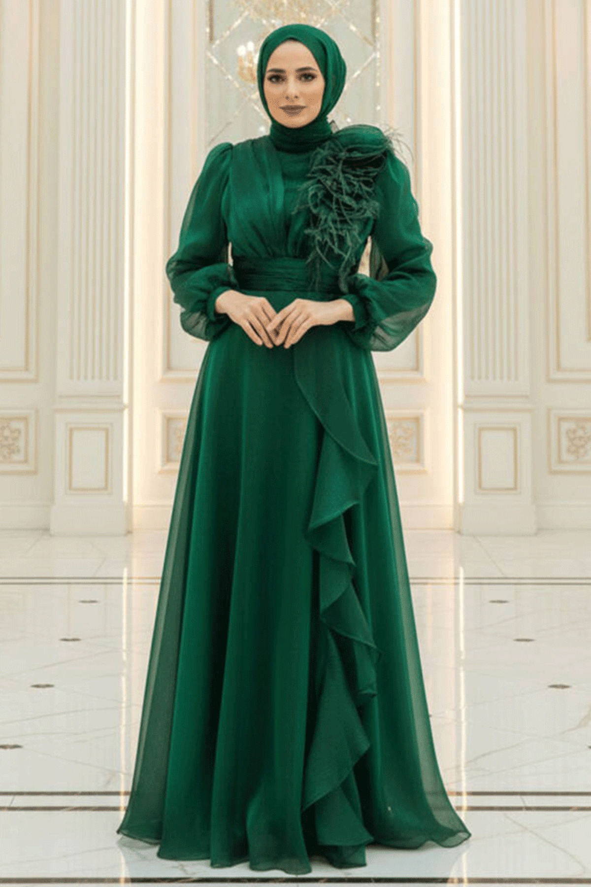 Çiçek Detaylı Yeşil Tesettür Abiye Elbise 22232Y Çiçek Detaylı Yeşil Tesettür Abiye Elbise 22232Y EGS-22232 46