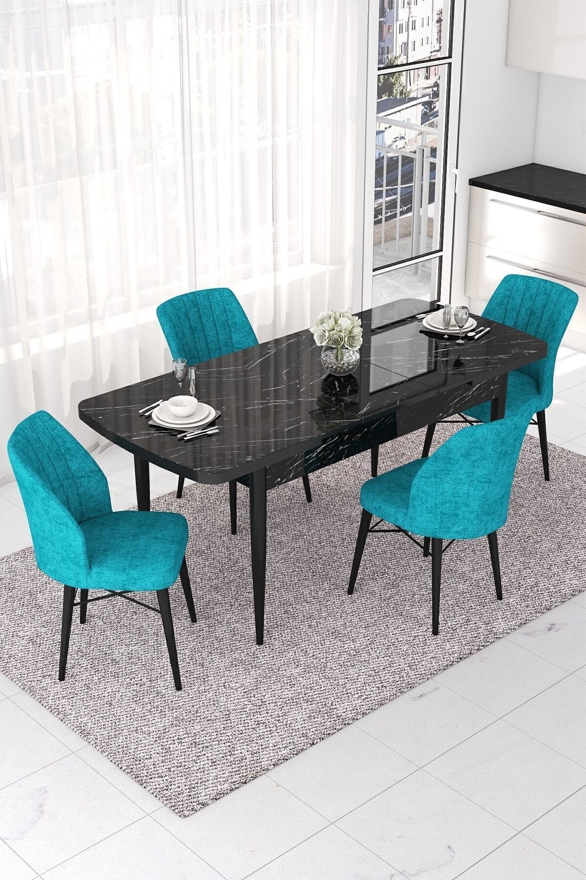 Nef Serisi 70x114 Açılabilir Mdf Mutfak Masa Takımı Siyah Mermer Desen Masa-4 Turkuaz Sandalye Nef Serisi 70x114 Açılabilir Mdf Mutfak Masa Takımı Siyah Mermer Desen Masa-4 Turkuaz Sandalye PRA-5293959-912871 تک سایز