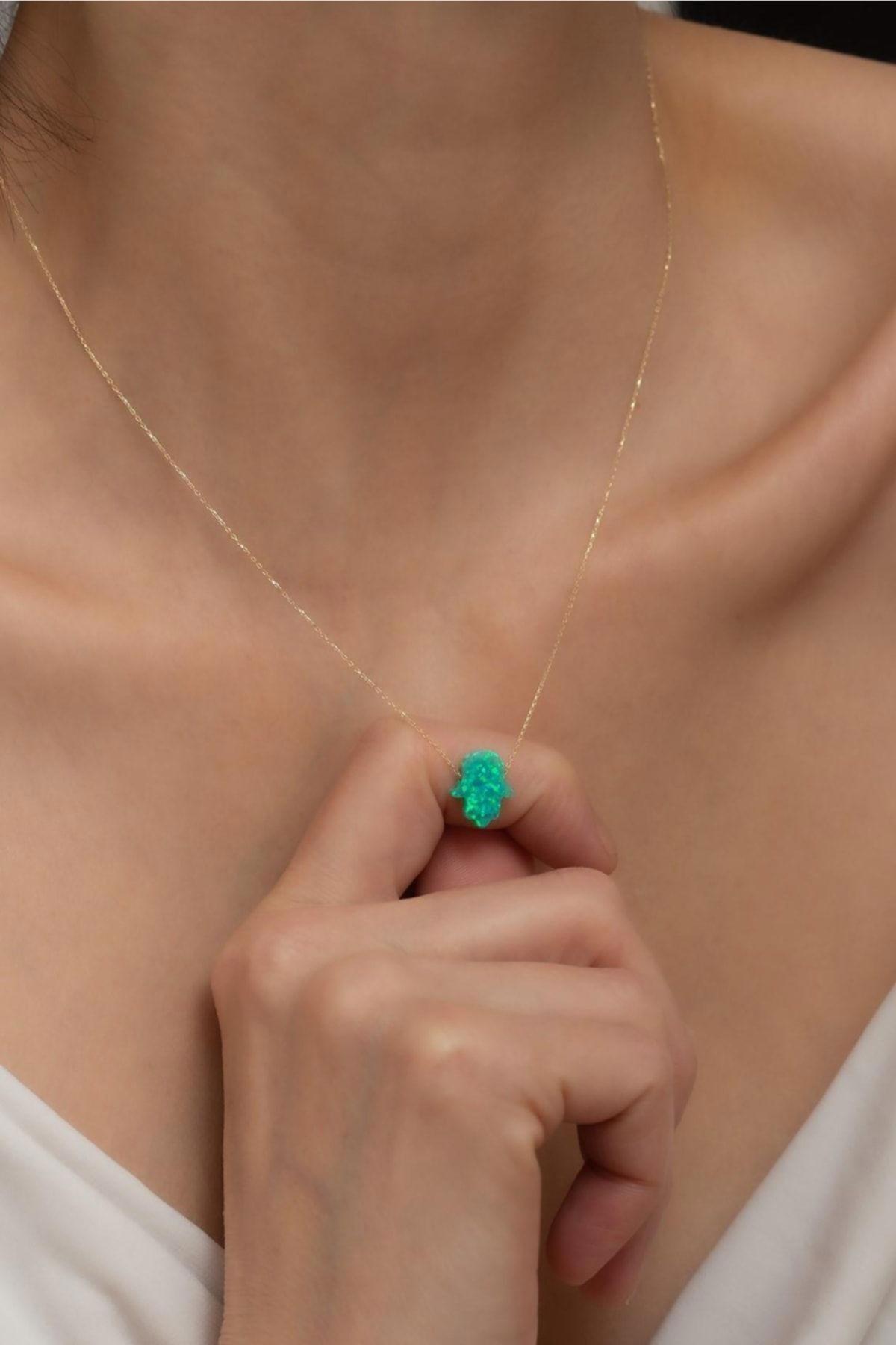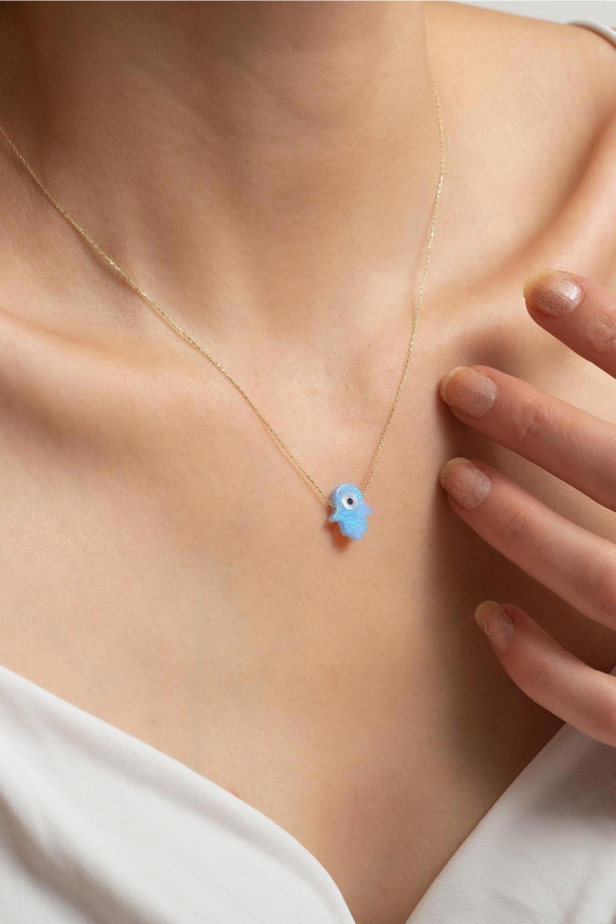 14 Ayar Altın Gözlü Mavi Fatma Ana Eli Kolye 14 Ayar Altın Gözlü Mavi Fatma Ana Eli Kolye KLYGZLMVFTMANEL 40 cm
