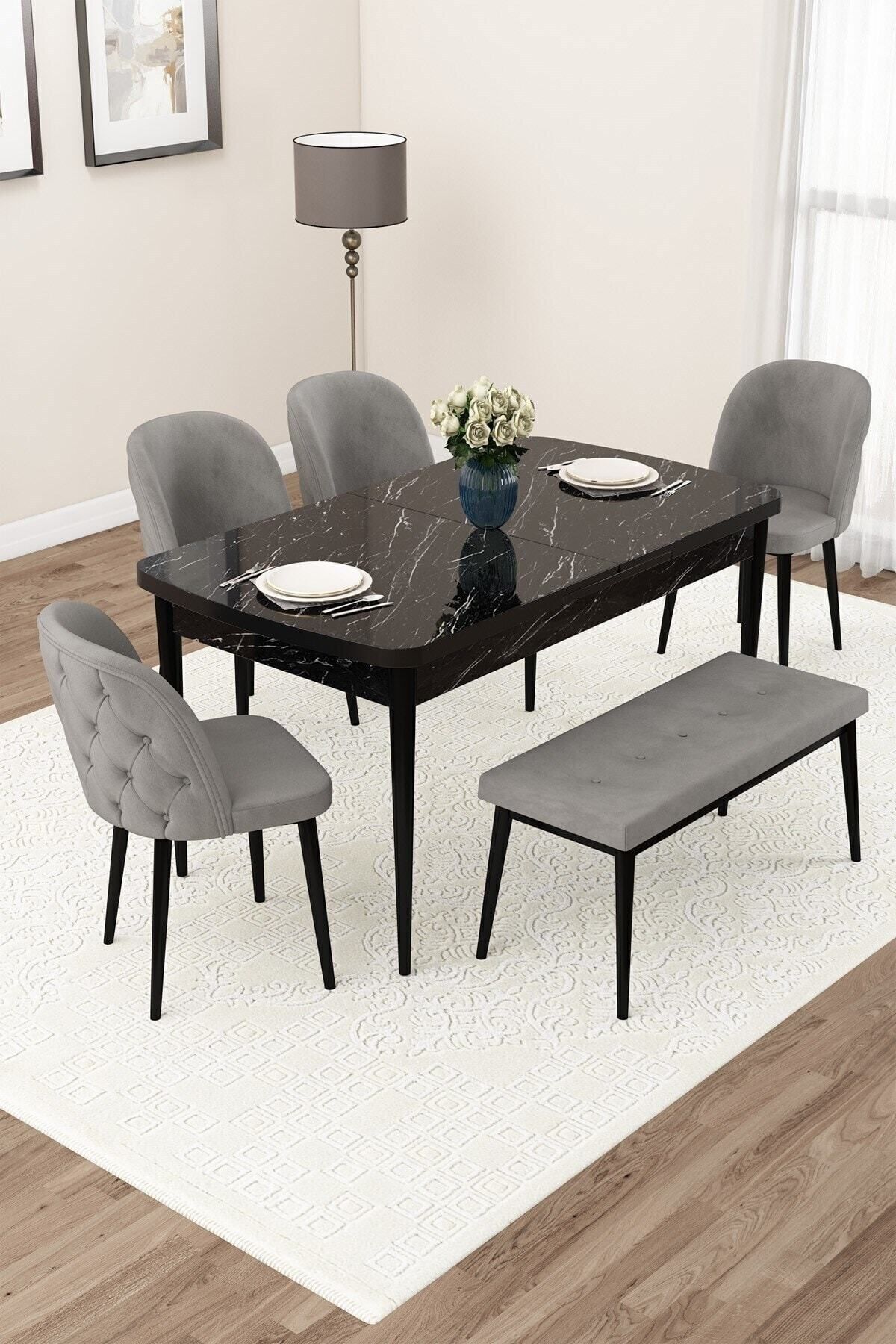 Eva Serisi 80x132 Açılabilir MDF Mutfak Masası Takımı Barok Desen Masa 4 Füme Sandalye 1 Bench Eva Serisi 80x132 Açılabilir MDF Mutfak Masası Takımı Barok Desen Masa 4 Füme Sandalye 1 Bench EVA 4 SANDALYE 1 BENCH تک سایز