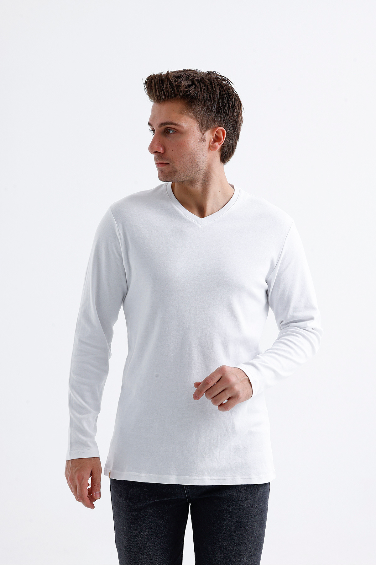 Erkek Beyaz Bambu Uzun Kollu V Yaka T-shirt Erkek Beyaz Bambu Uzun Kollu V Yaka T-shirt YLDZ-485 2XL