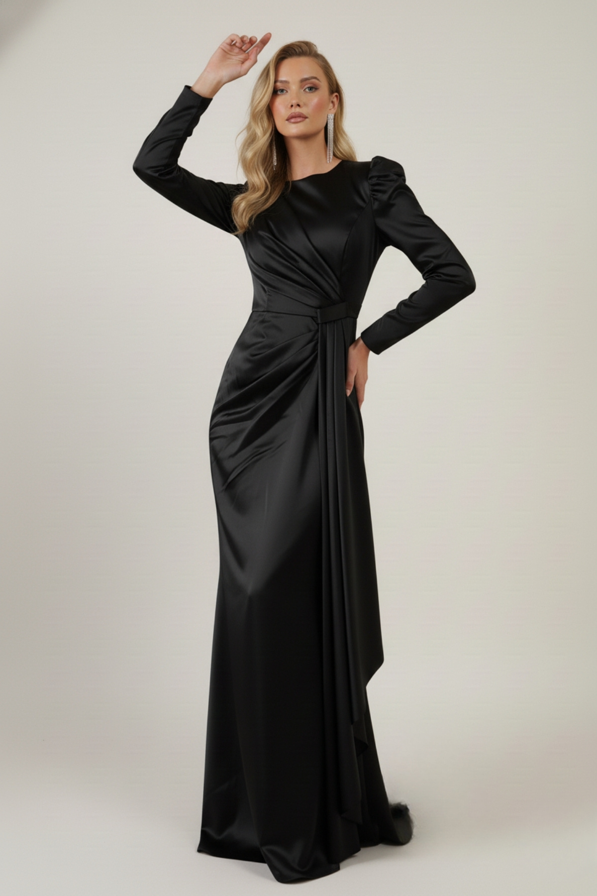 Önü Pile Detaylı Astarlı Uzun Kollu Saten Uzun Elbise Önü Pile Detaylı Astarlı Uzun Kollu Saten Uzun Elbise S-22K0190002-Siyah 3XL