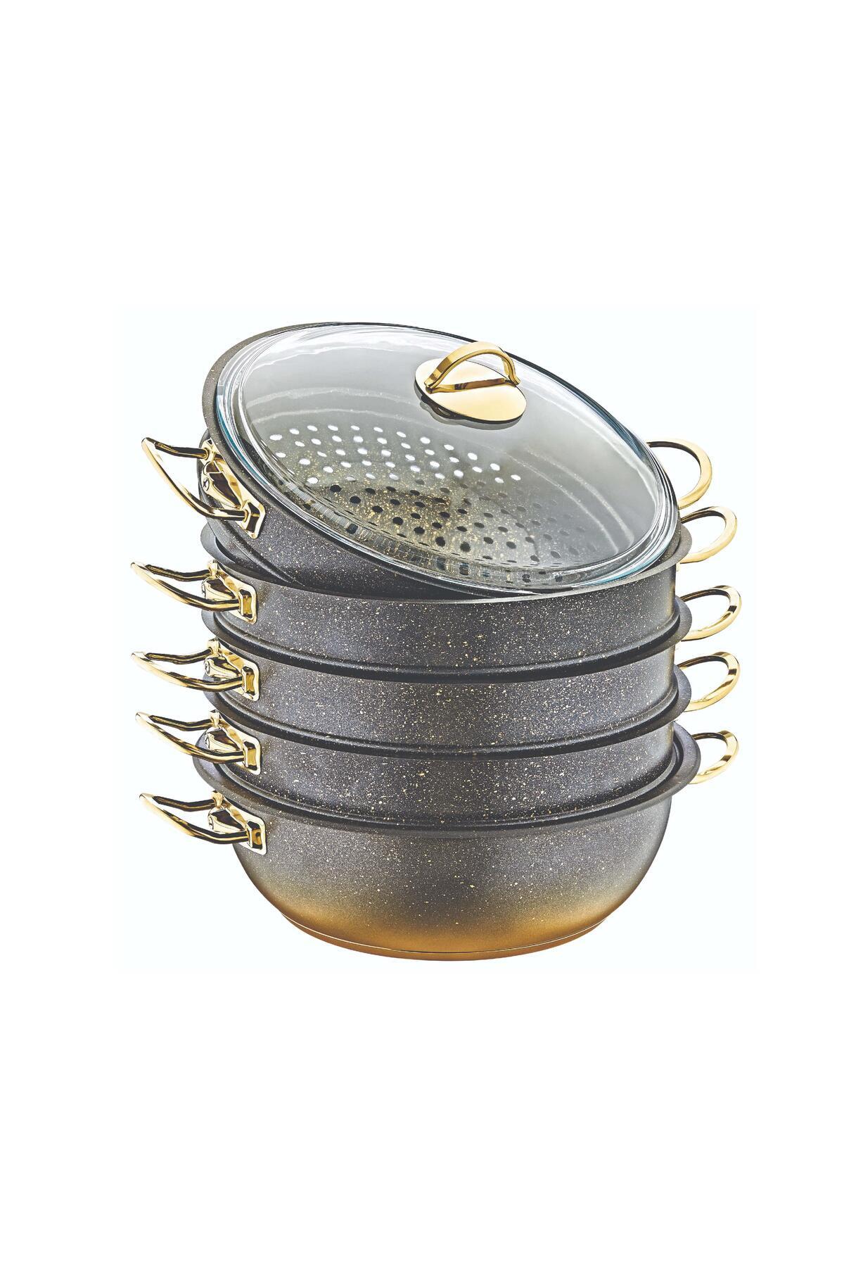 6091c - 6 Parça Bio Granit, 32 Cm- 9,0 Litre Özbek Buharlı Mantı Tencere Seti Mavi Gövde, Gold Detay 6091c - 6 Parça Bio Granit, 32 Cm- 9,0 Litre Özbek Buharlı Mantı Tencere Seti Mavi Gövde, Gold Detay 6091-C-32-MAV تک سایز