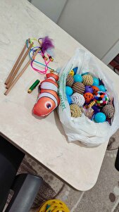 eksiksiz geldi ve kargo hızlıydı. üç katlı oyuncağı ve sesli topu çok sevdi. olta çok kısa, bize fazla dayanmadı ipi açıldı. tüylü ve tüysüz topu sevdik.