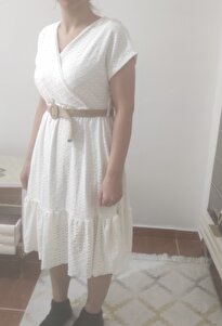 Kadın Ekru Kruvaze Yaka Beli Lastikli Hasır Kemerli Fisto Elbise CT08078 Kadın Ekru Kruvaze Yaka Beli Lastikli Hasır Kemerli Fisto Elbise CT08078 L