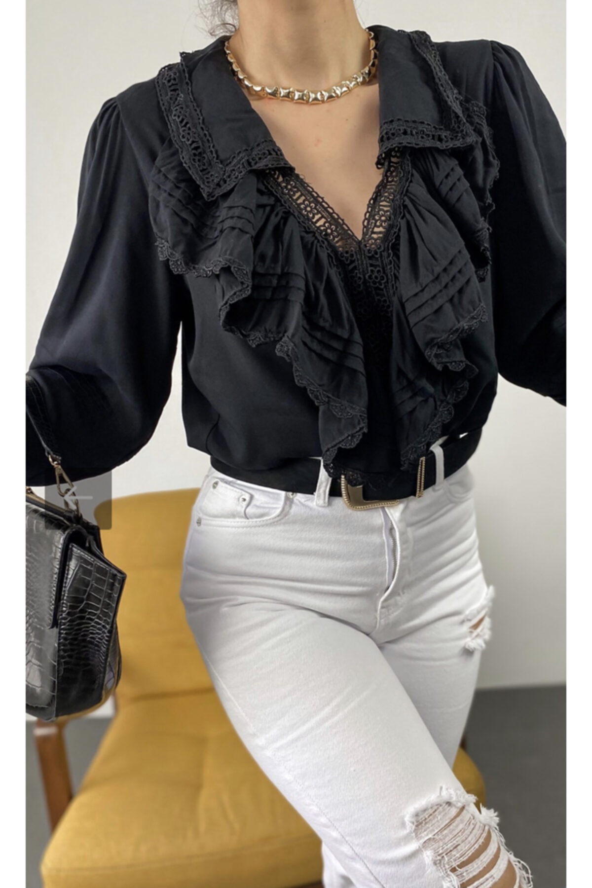 Kadın Siyah Güpür Ve Dantel Detaylı Volanlı Bohem Pamuklu Bluz Kadın Siyah Güpür Ve Dantel Detaylı Volanlı Bohem Pamuklu Bluz MK00024 L