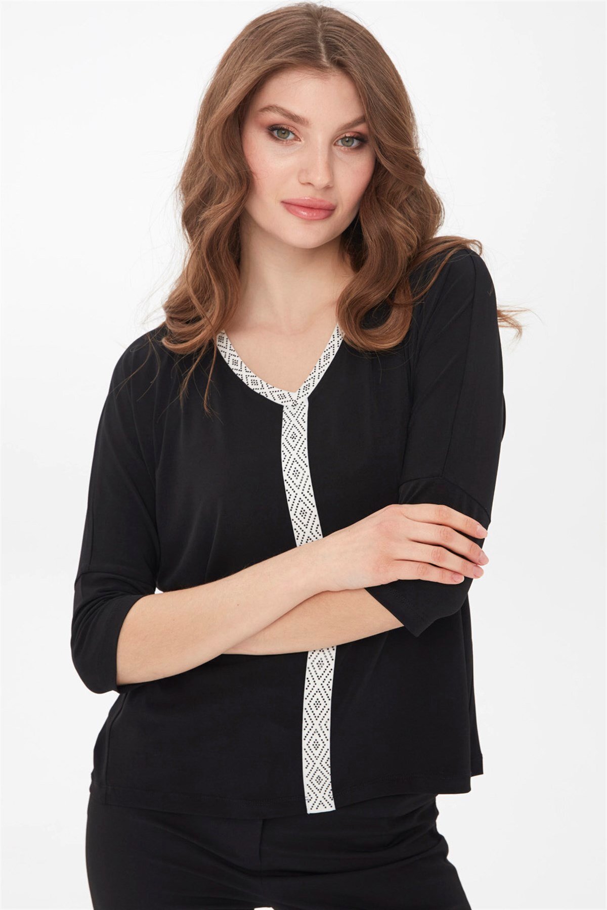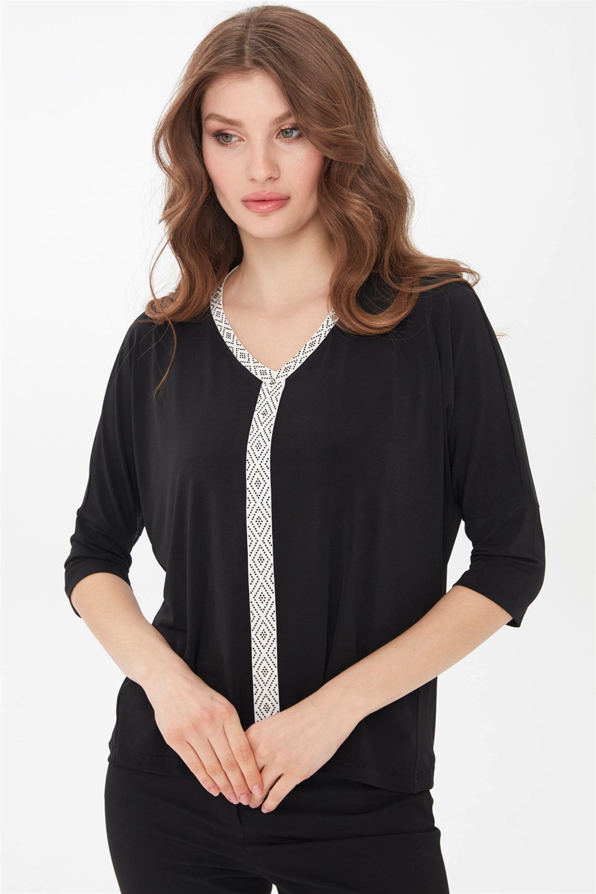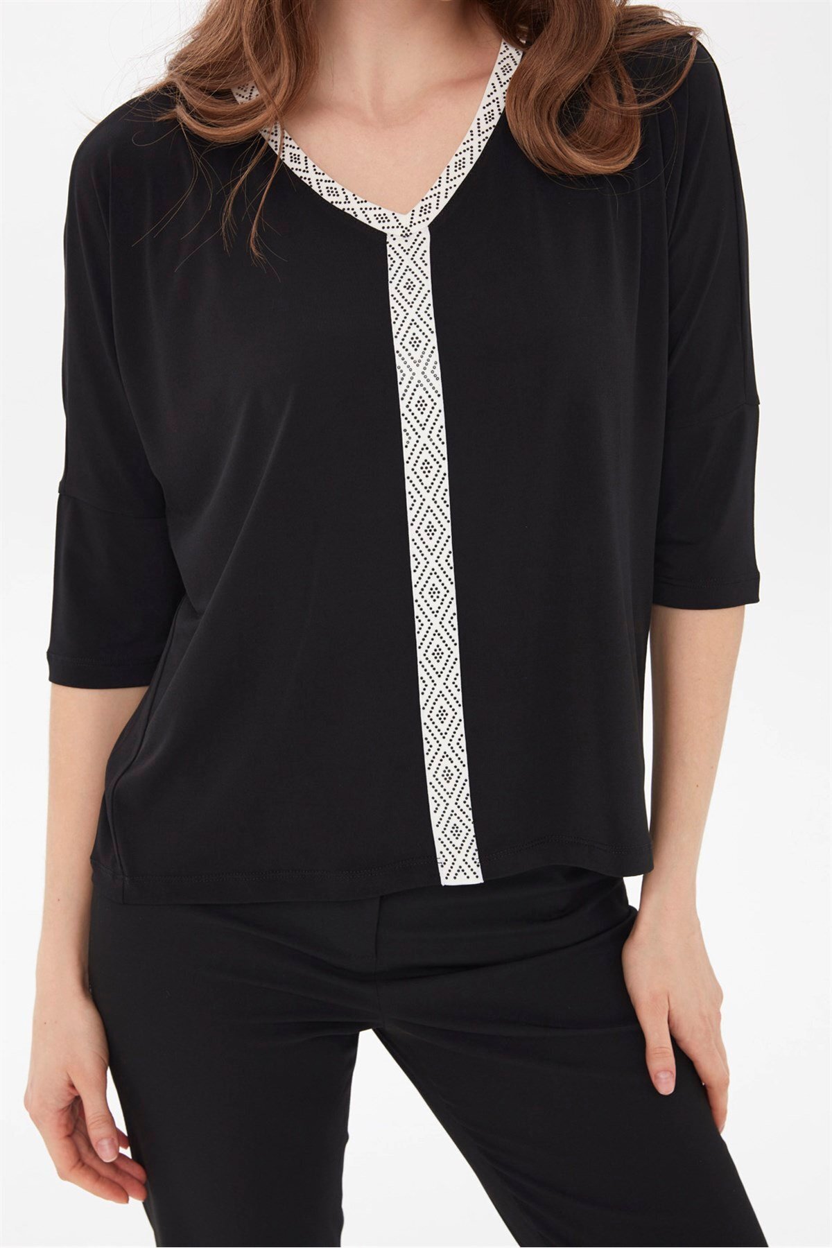 Kadın Önü Taş Işlemeli Truvakar Kol Bluz Siyah Kadın Önü Taş Işlemeli Truvakar Kol Bluz Siyah 21721 L
