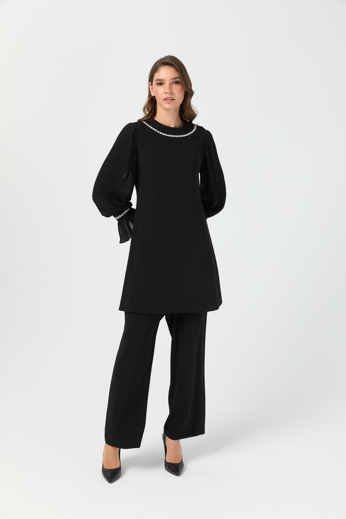 Yaka Kenarı Zincir Aksesuarlı Eteği Kırma Şifon Detaylı Pantolonlu Takım Siyah Yaka Kenarı Zincir Aksesuarlı Eteği Kırma Şifon Detaylı Pantolonlu Takım Siyah 2117144200 52