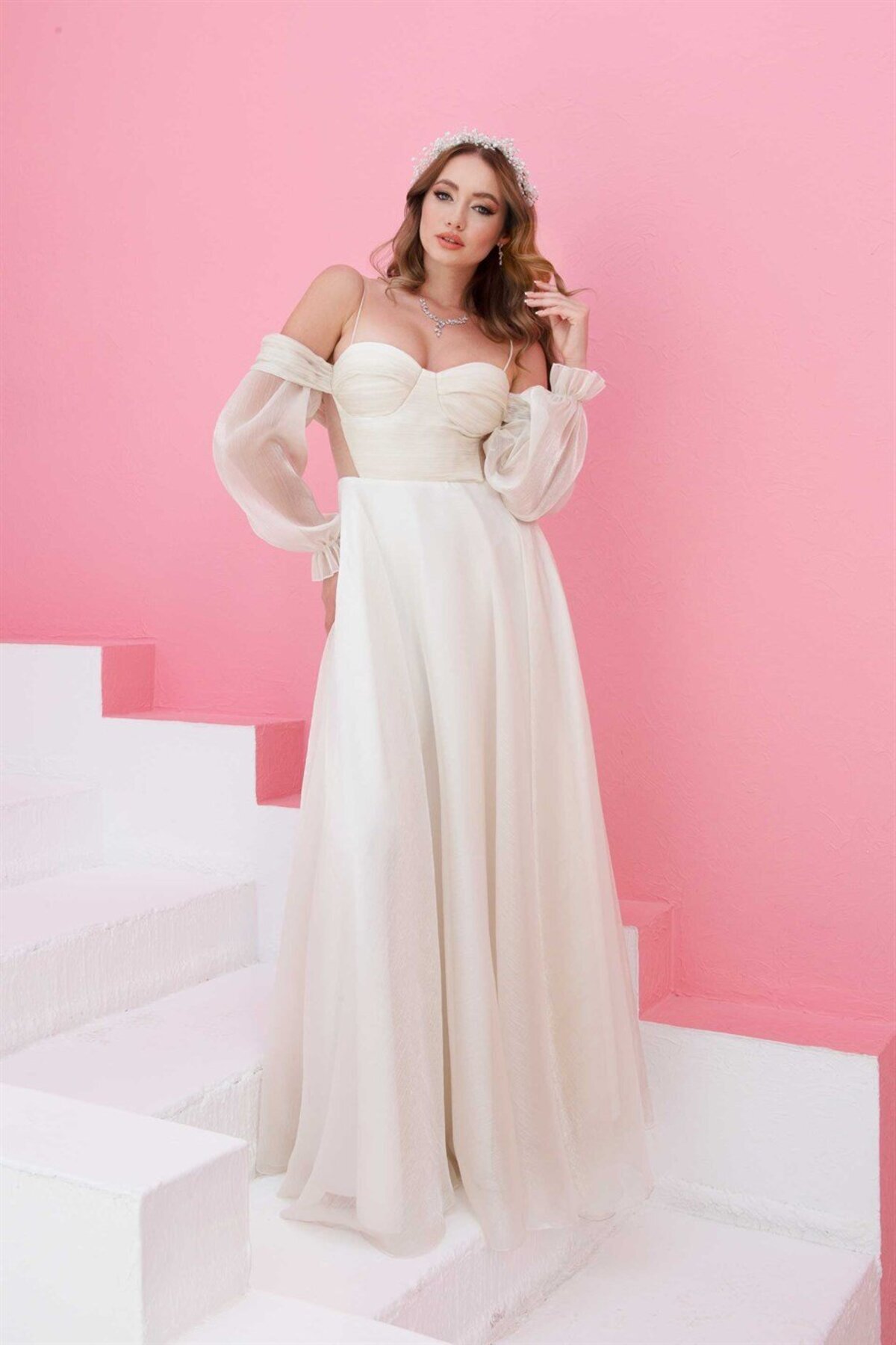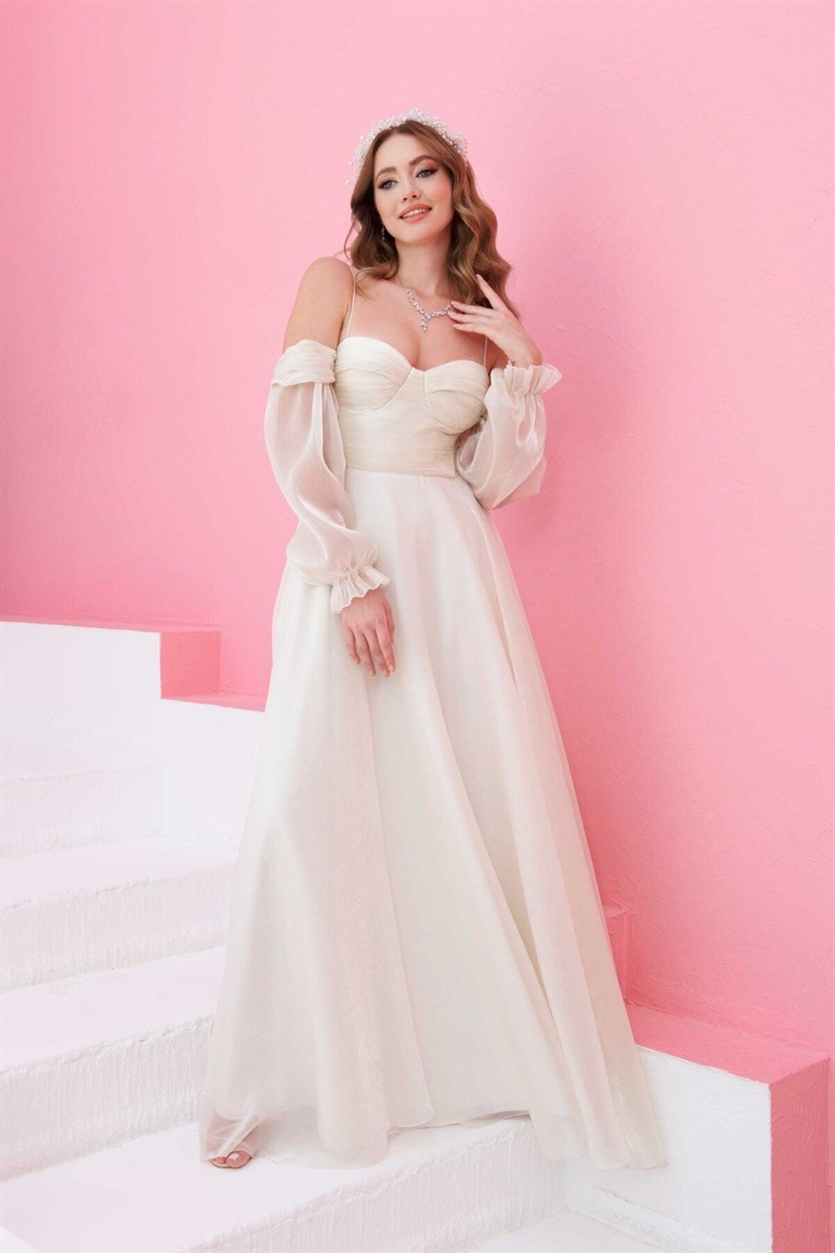 Ekru Organze Düşük Kollu Nikah Abiye Elbise Ekru Organze Düşük Kollu Nikah Abiye Elbise 55930 42