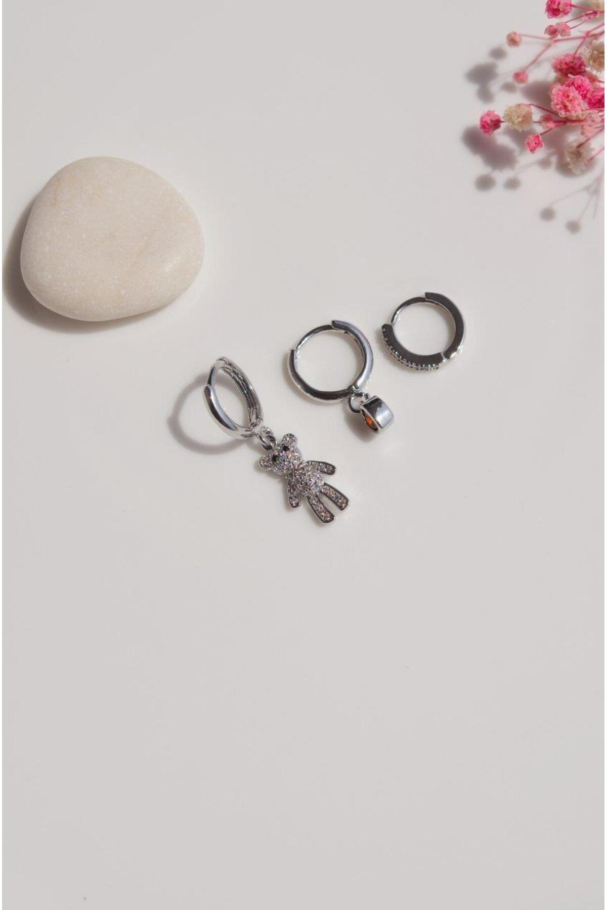 Ayıcık Kalp Detaylı 3'lü Küpe Seti Gümüş Renk Ayıcık Kalp Detaylı 3'lü Küpe Seti Gümüş Renk GKLRV147 تک سایز