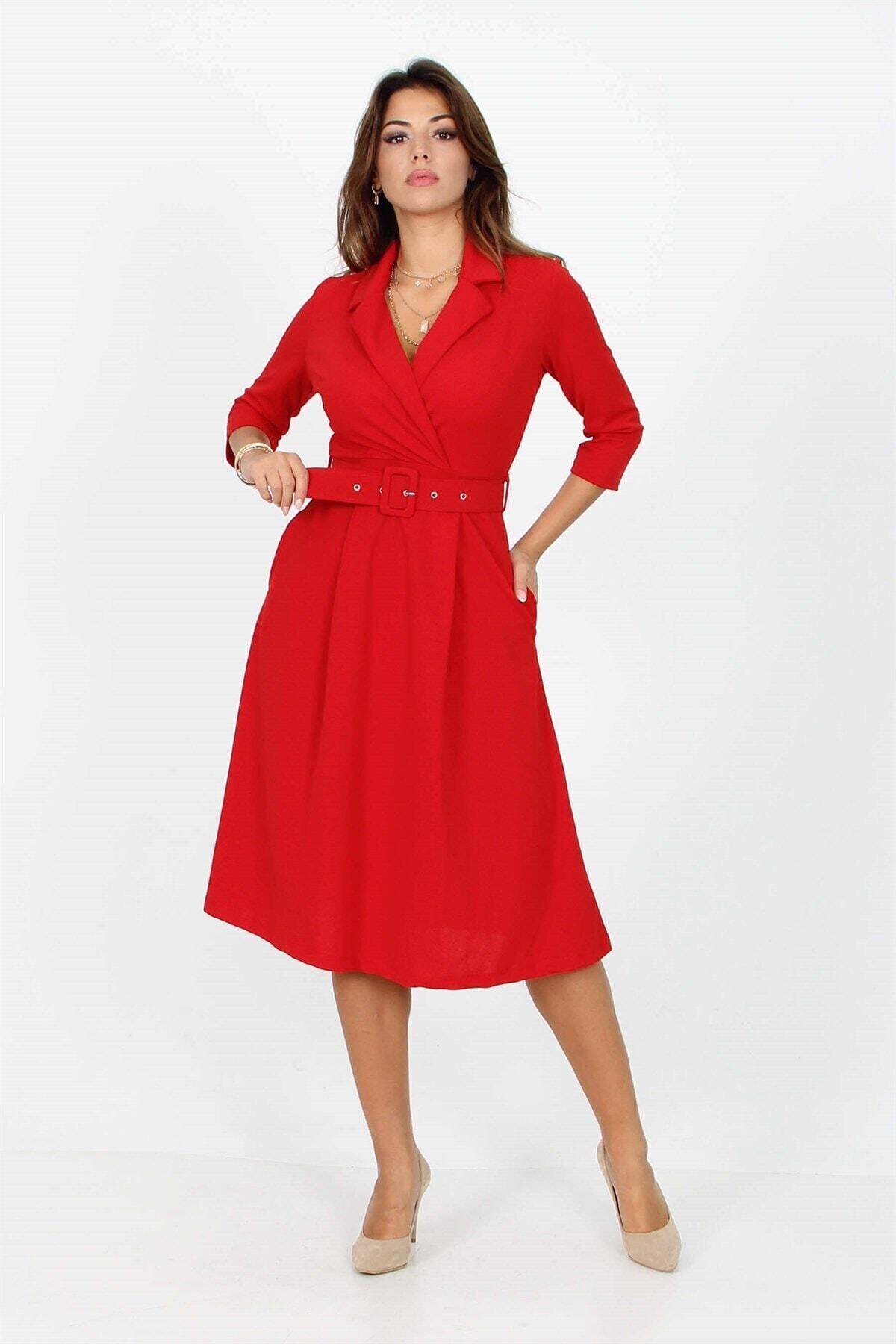 Kadın Kırmızı Esnek Krep Kumaş Piliseli Kuşak Detaylı Kısa Kollu Midi Boy Elbise Emr 120 Kadın Kırmızı Esnek Krep Kumaş Piliseli Kuşak Detaylı Kısa Kollu Midi Boy Elbise Emr 120 4S1B-EMR-120 L