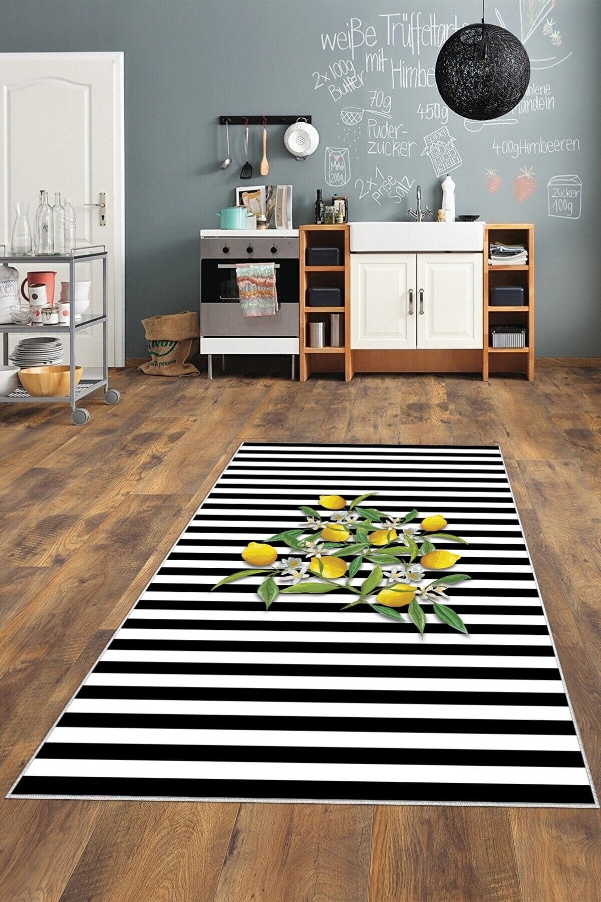 Beyaz Siyah Şeritli Limonlu Yıkanabilir Kaymaz Taban Leke Tutmaz Modern Salon Halısı Ve Yolluk Beyaz Siyah Şeritli Limonlu Yıkanabilir Kaymaz Taban Leke Tutmaz Modern Salon Halısı Ve Yolluk AYHMOD15 160 x 230