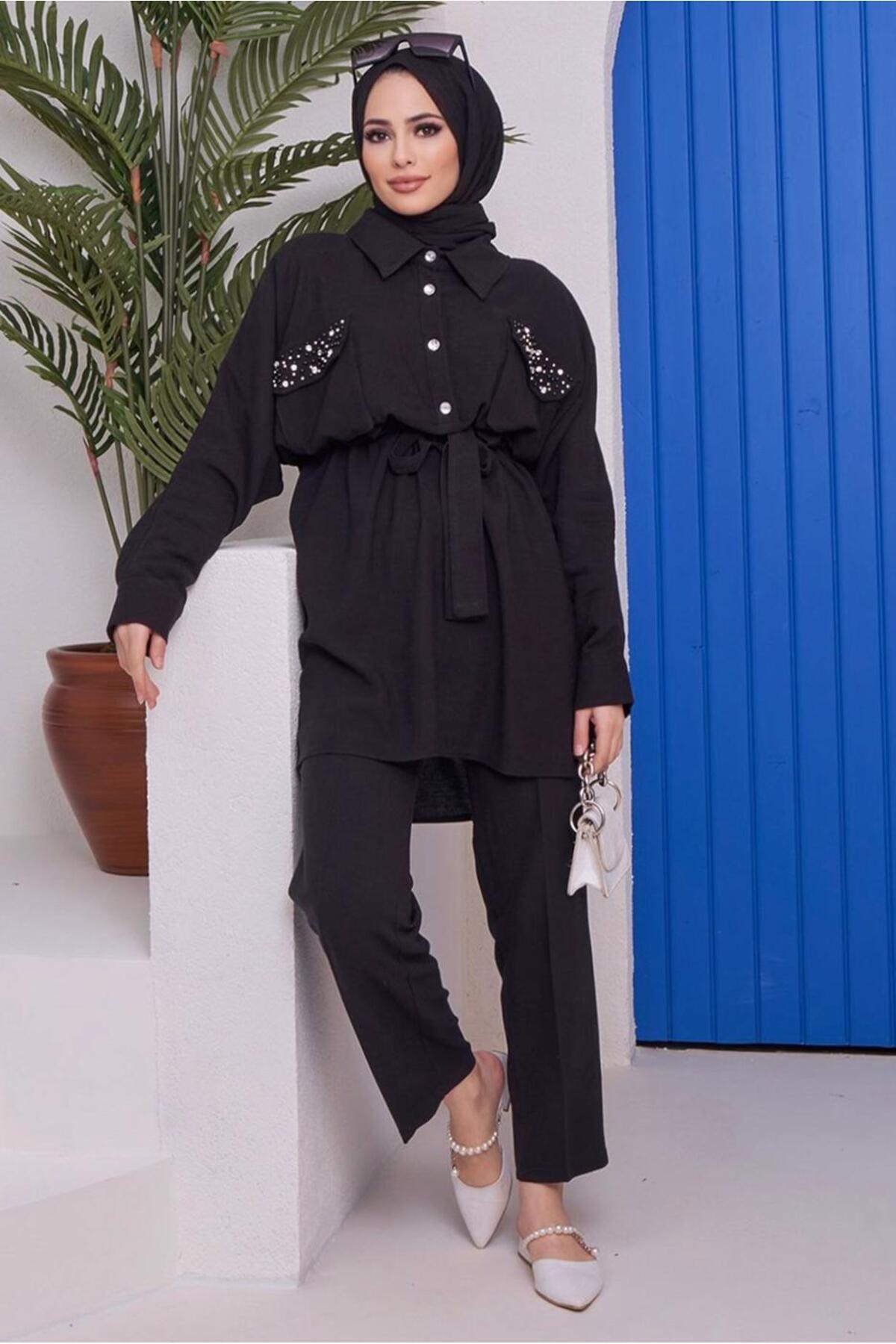 KADIN SİYAH CEPLERİ BONCUK İŞLEMELİ BELİ BÜZGÜLÜ İKİLİ PANT. TAKIM 80051 KADIN SİYAH CEPLERİ BONCUK İŞLEMELİ BELİ BÜZGÜLÜ İKİLİ PANT. TAKIM 80051 22YTKPTR80051 38-40