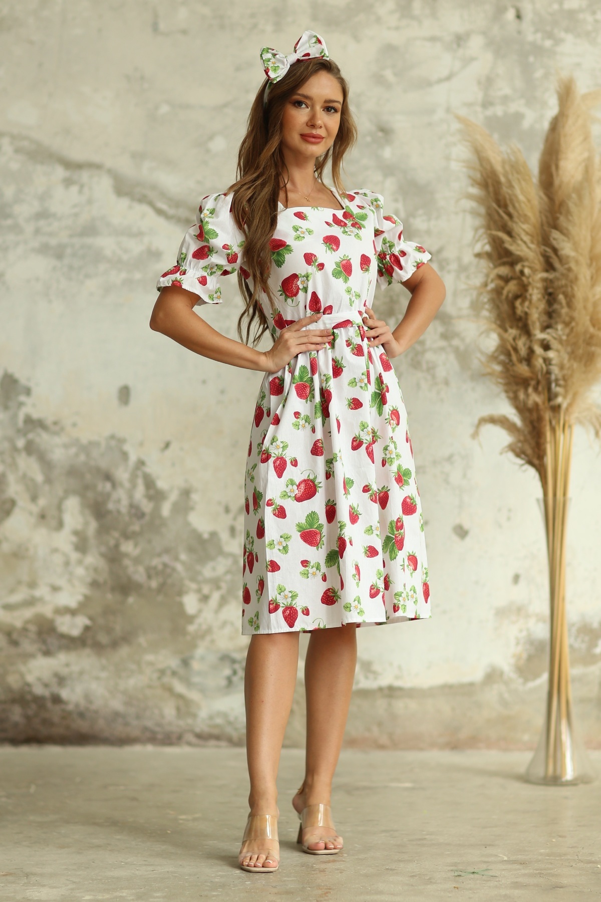 Çilek Desenli Belden Büzgülü Elbise Çilek Desenli Belden Büzgülü Elbise KCGM10049 3XL