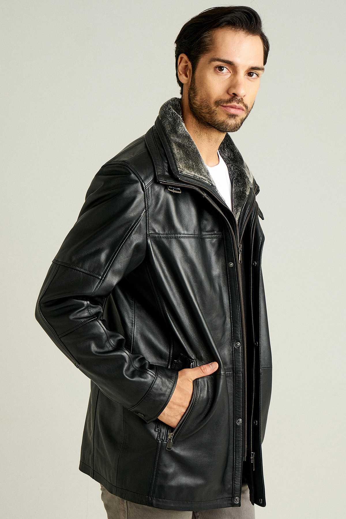 Eduardo Erkek Siyah Çift Yakalı Kürklü Deri Kaban 14WGE61031M Eduardo Erkek Siyah Çift Yakalı Kürklü Deri Kaban 14WGE61031M 3XL