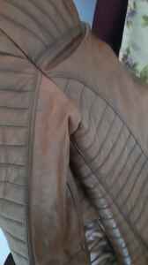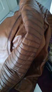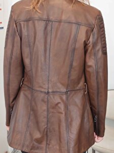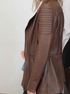 Hakiki Deri Kahverengi Omuzdan Düz Çizgi Desenli Yandan Cepli Kadın Deri Mont Hakiki Deri Kahverengi Omuzdan Düz Çizgi Desenli Yandan Cepli Kadın Deri Mont KM-6016 3XL