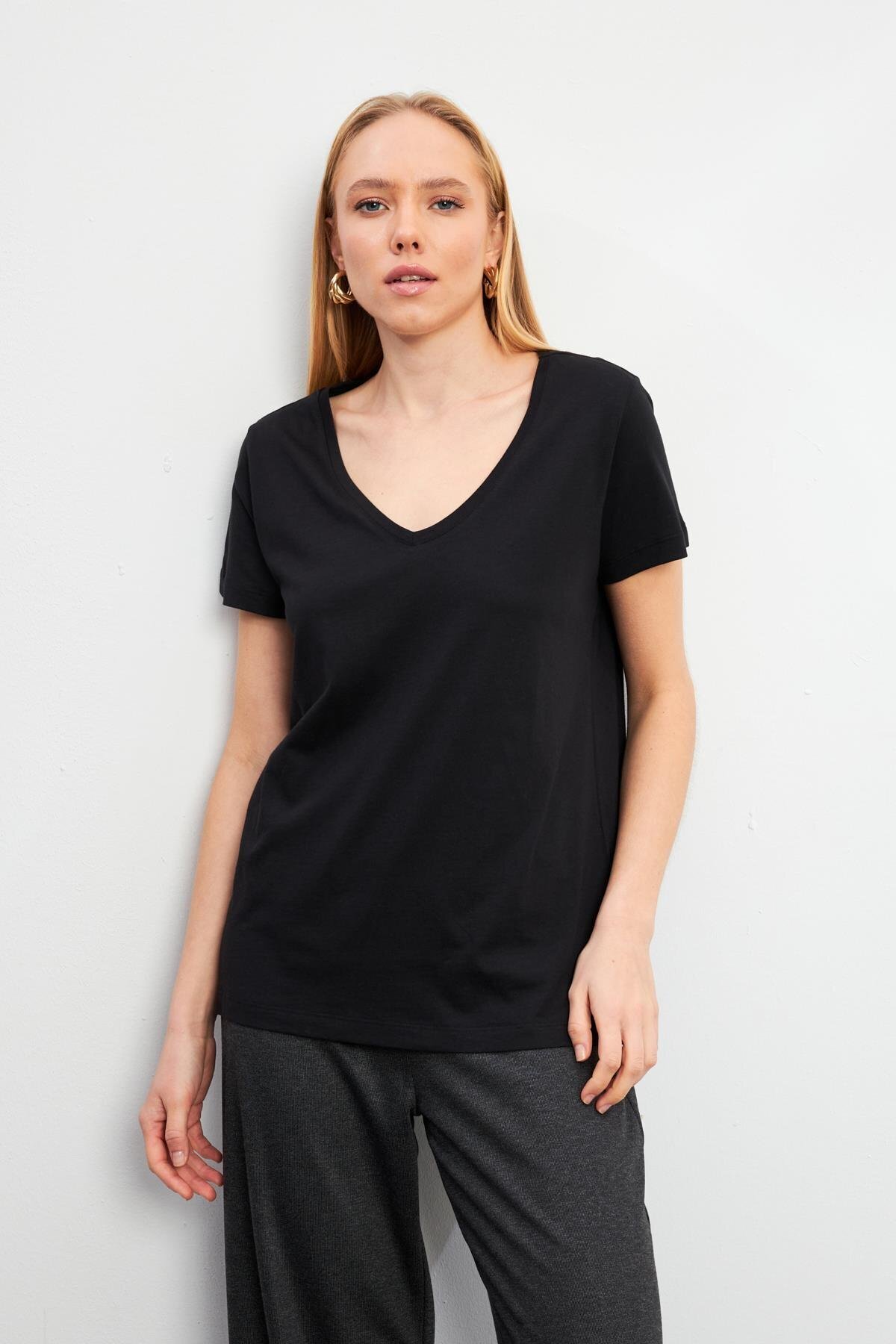 Kadın Boyfriend Siyah V Yaka Regular Fit Modal Tişört (LYOCELL) - 25645-028 Kadın Boyfriend Siyah V Yaka Regular Fit Modal Tişört (LYOCELL) - 25645-028 XXS