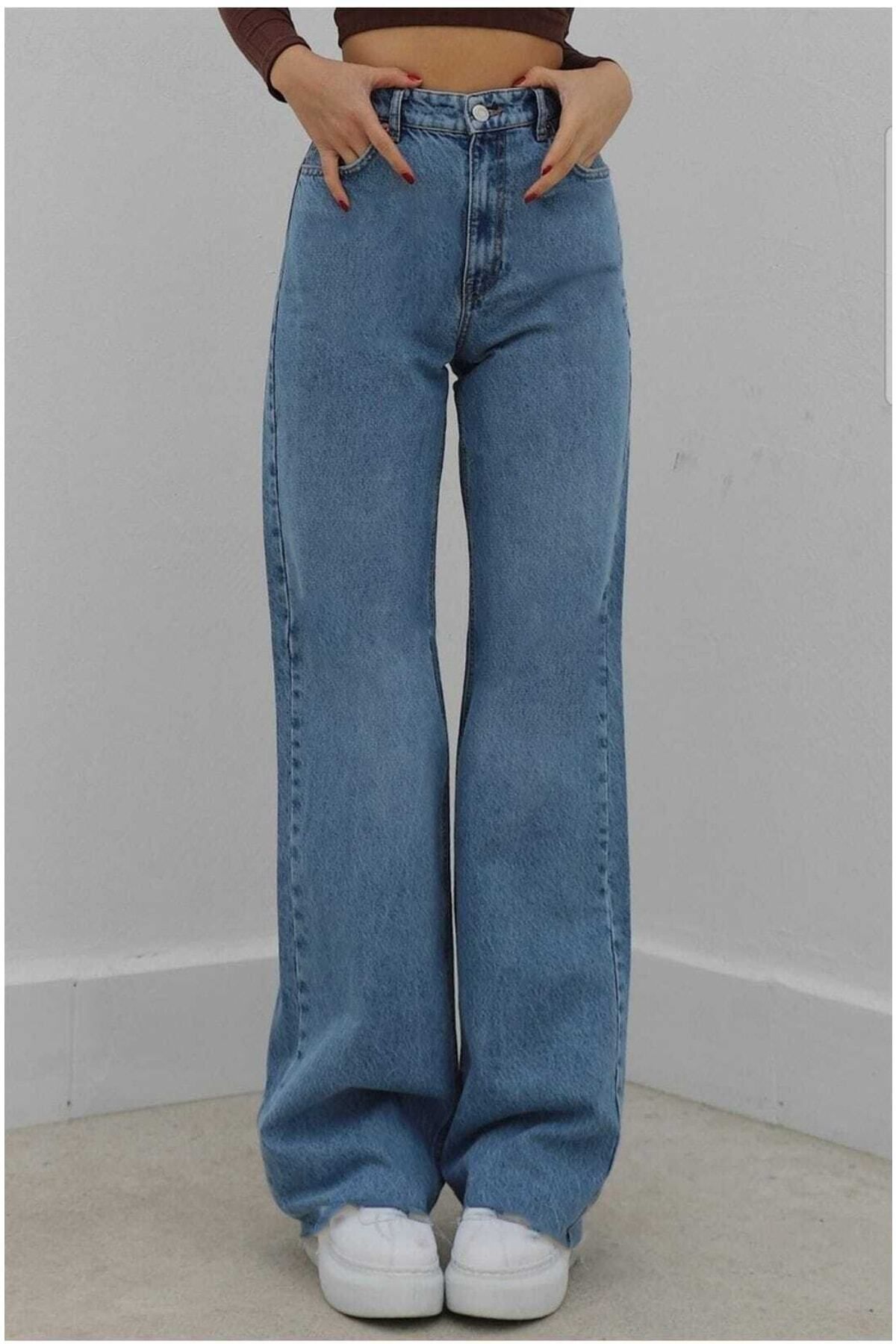 Orta Mavi Likralı Süper Yüksek Bel Salaş Jeans Palazzo Pantolon Wide Leg Orta Mavi Likralı Süper Yüksek Bel Salaş Jeans Palazzo Pantolon Wide Leg sls1537 44