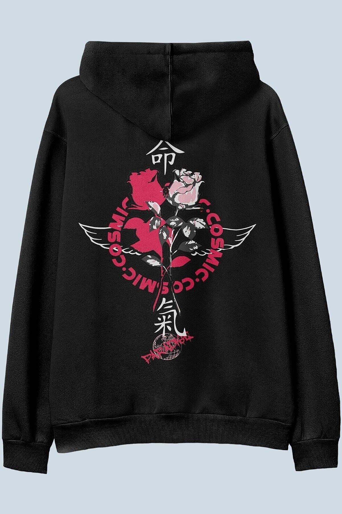 Kadın Siyah Bisiklet Yaka Sweatshirt Japon Çiçek Baskı Kadın Siyah Bisiklet Yaka Sweatshirt Japon Çiçek Baskı man-011 2XL