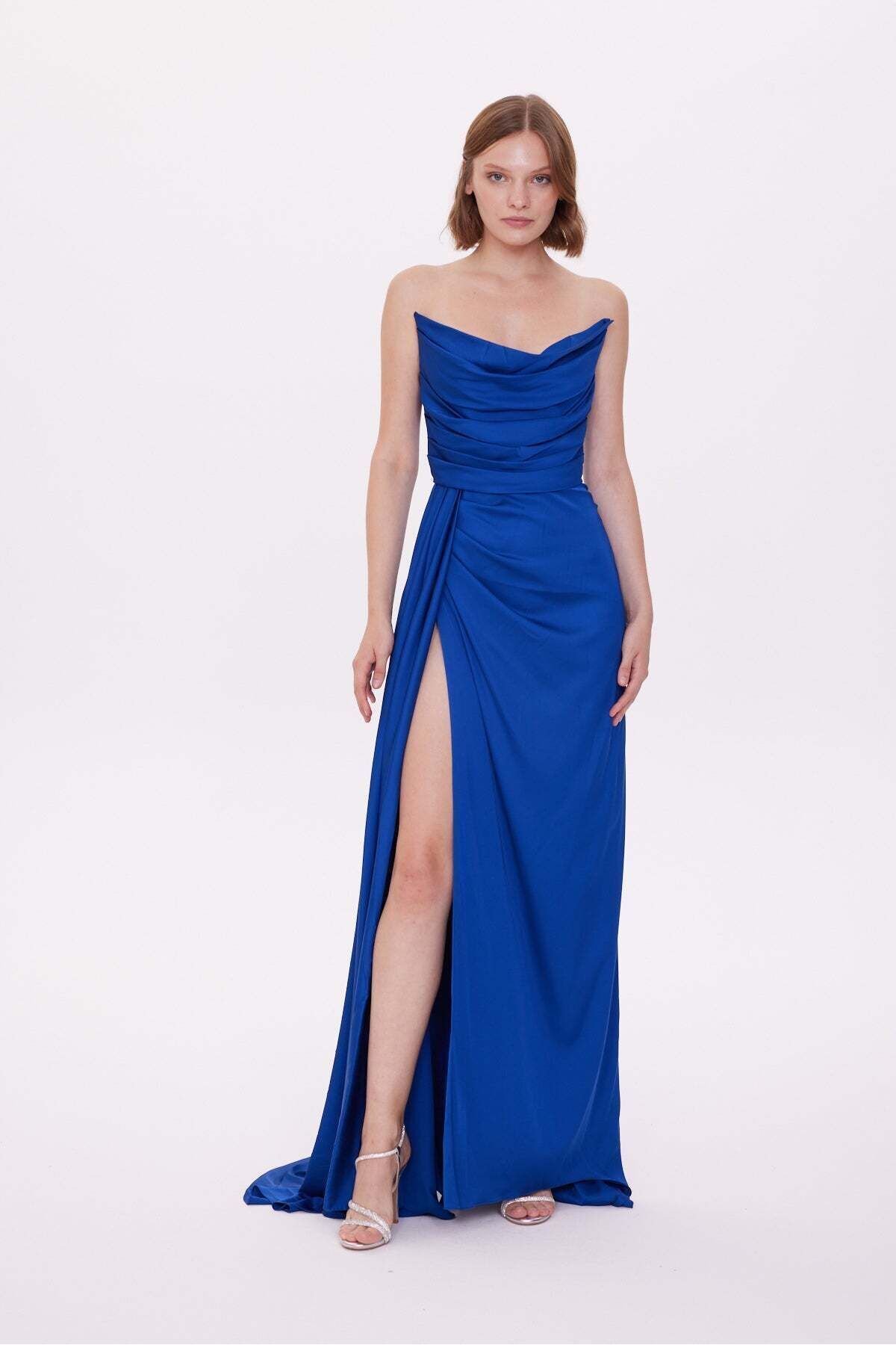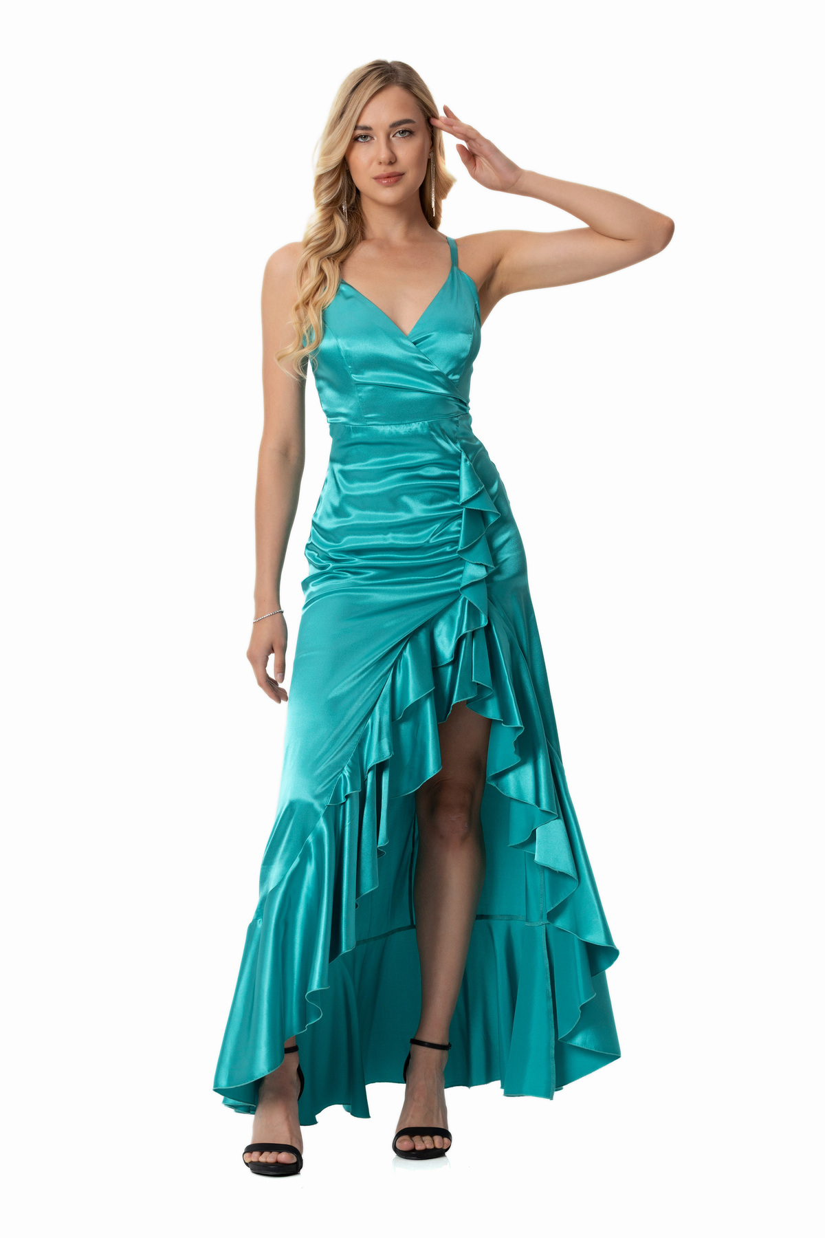Yırtmaçlı Kol Detaylı Saten Abiye Elbise Yırtmaçlı Kol Detaylı Saten Abiye Elbise 7259 40